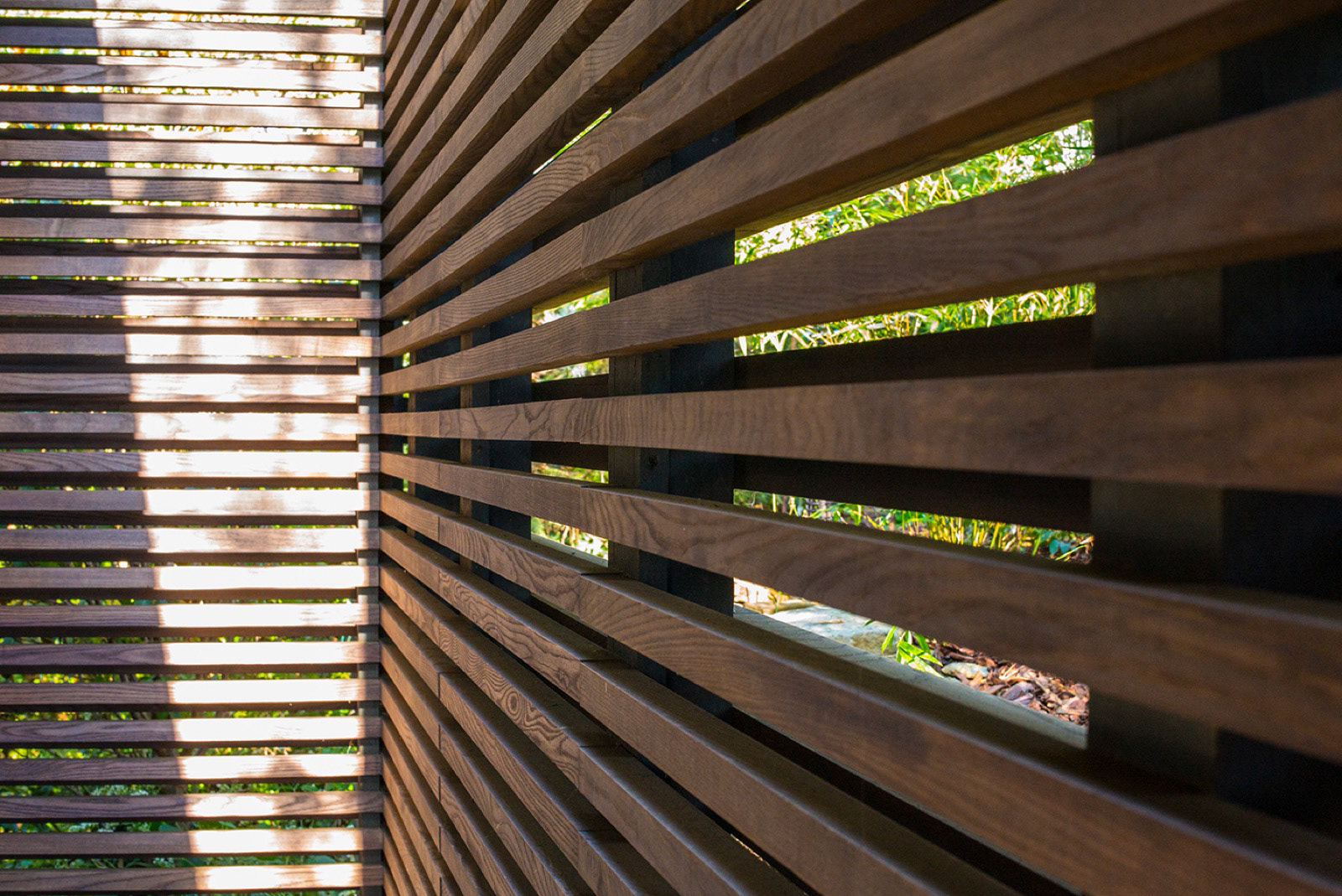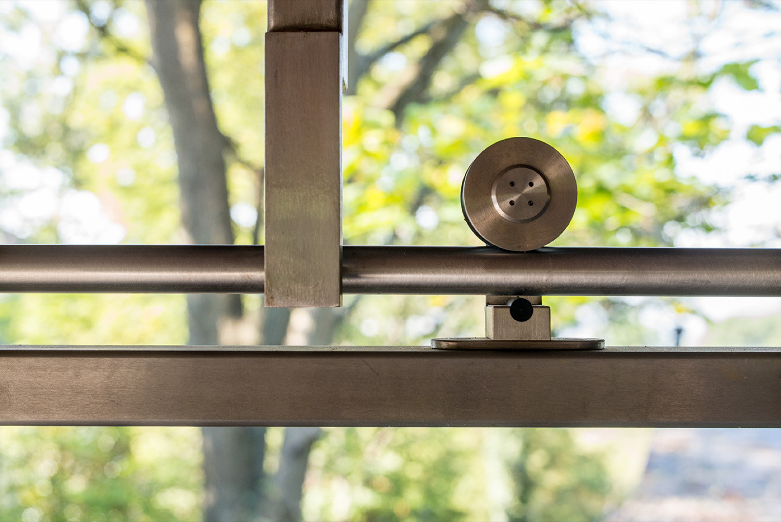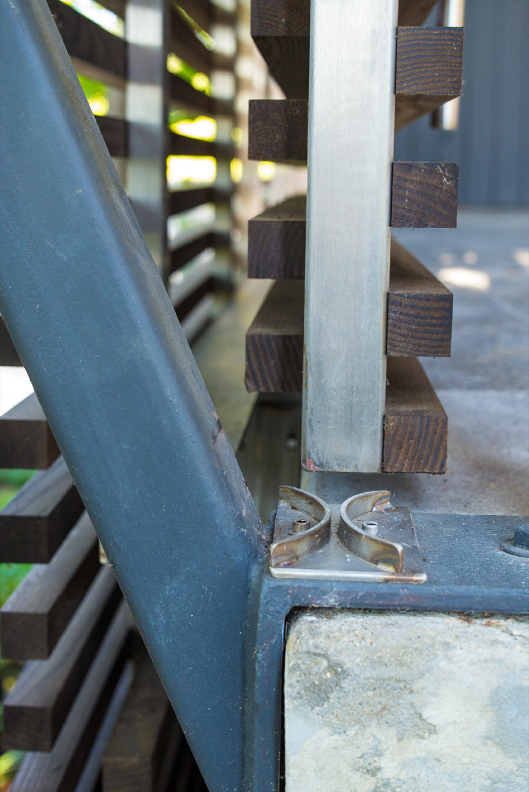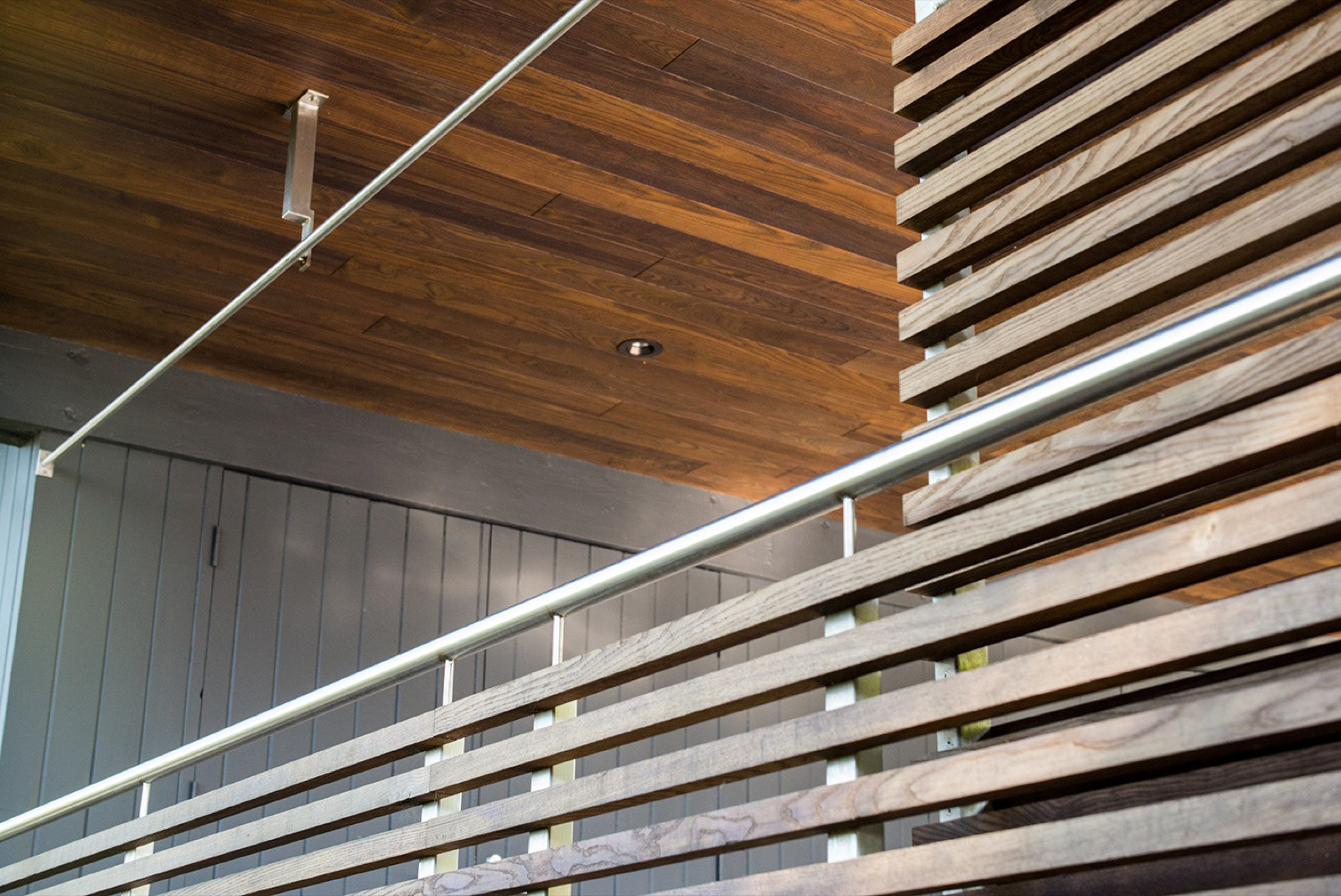 As the first node in this entry sequence, the carport becomes a double of the house in pavilion form. While the house is essentially a viewing stand for taking in the skyline and river valley, the carport above offers a view of the house together with the river valley (one where, in a strange picturesque inversion, the elevated horizon lifts the river above the house). In renovating the carport, we sought to further tie the carport together with the house by expanding the palette of materials. Most notable is the addition of a sliding wood and steel door that further dramatizes the entry sequence. The result is something akin to a tectonic amuse-bouche.