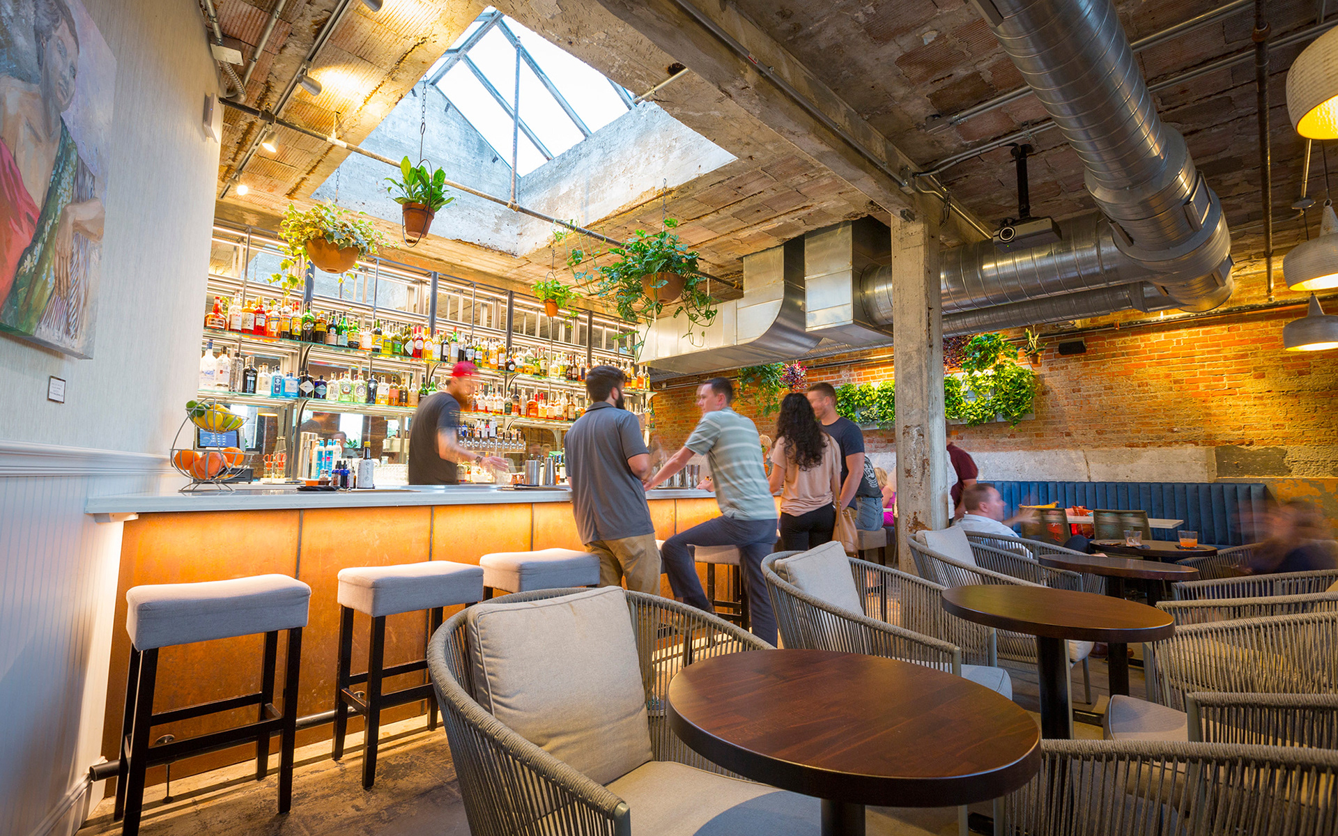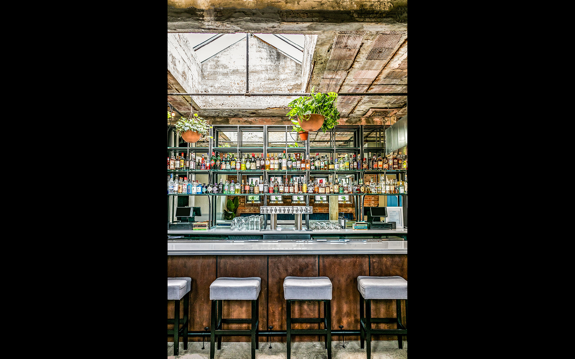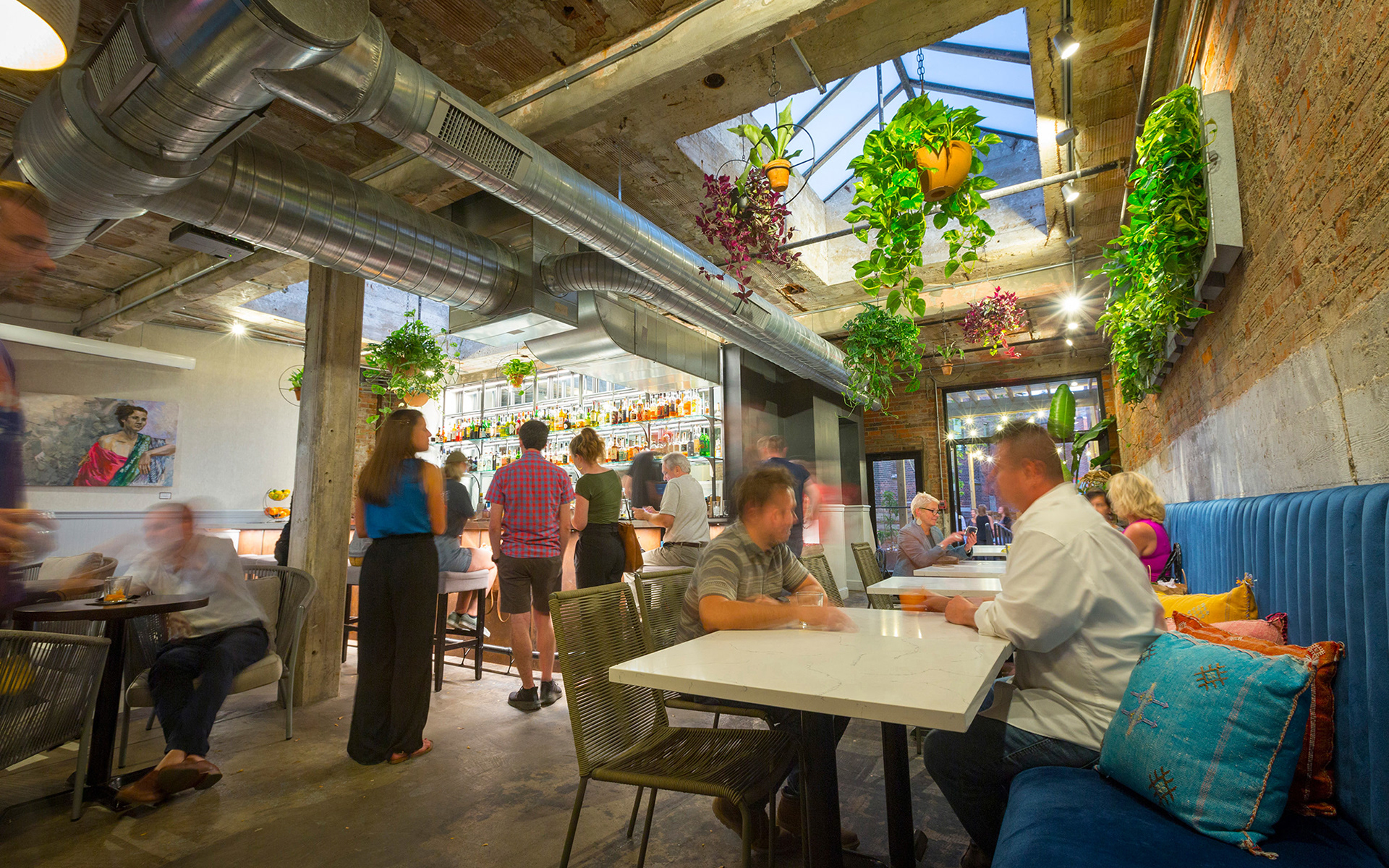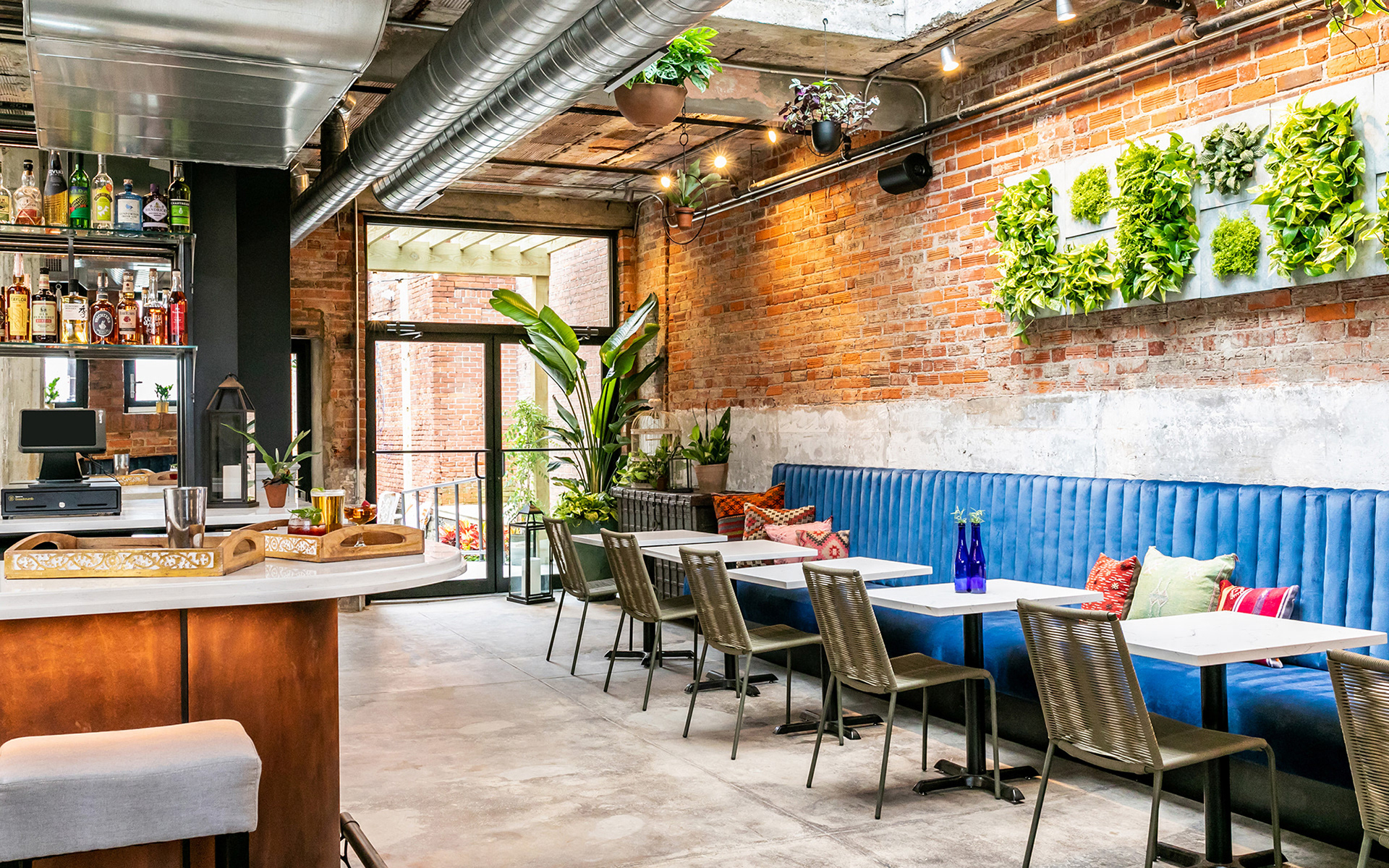The Grecian blue women’s door unveils a welcoming, light-filled space with large restored skylights and a delicate liquor display. The gritty rough-cast existing floors, ceiling and walls were “frozen,” and offer a stark juxtaposition to the vibrant furnishings and abundant greenery. Aligned with the front door, the back door opens to an urban oasis. Secluded within the urbanity of brick, the patio is flotsam and jetsam, however recovered by the collection of found things inspiring one to browse, configure and make place.