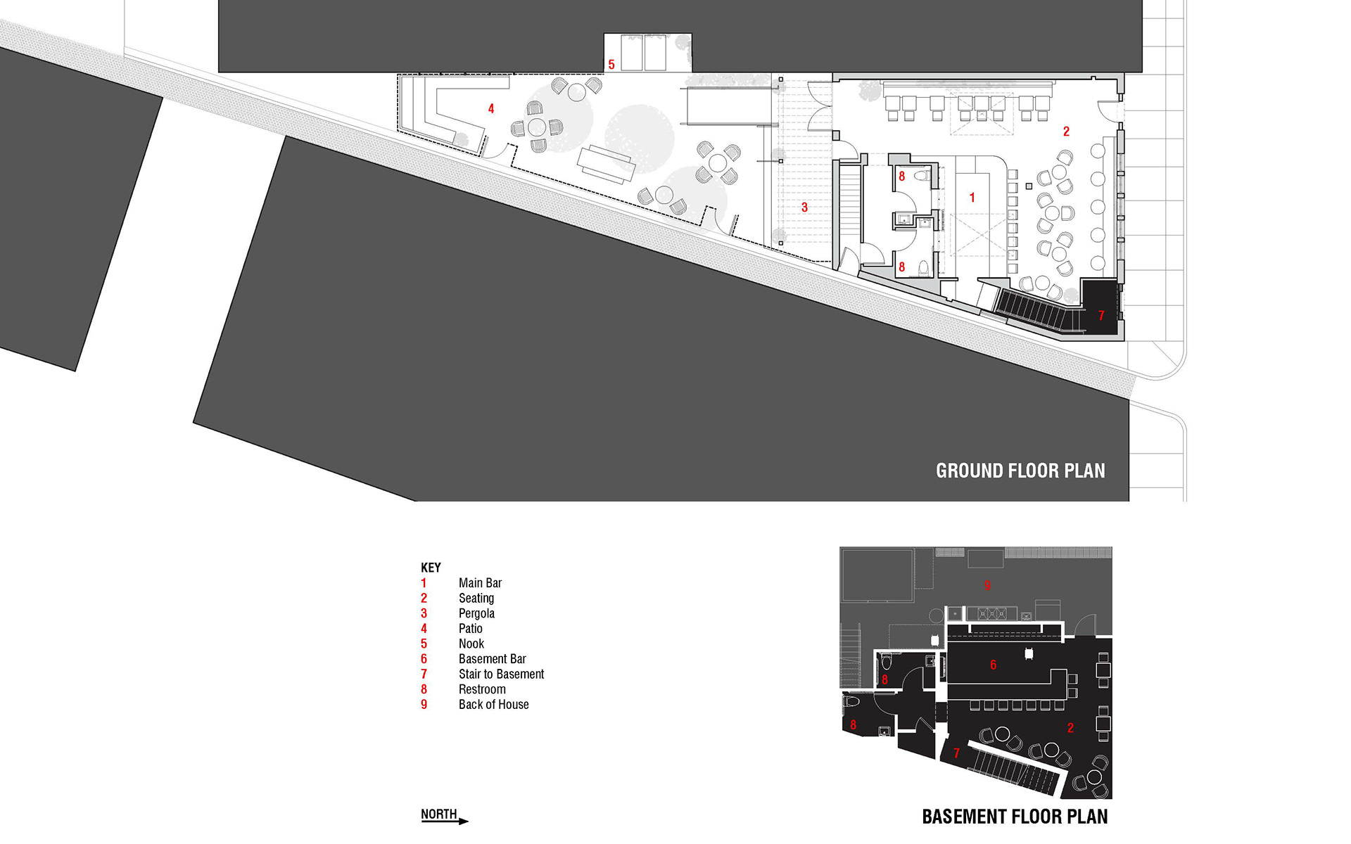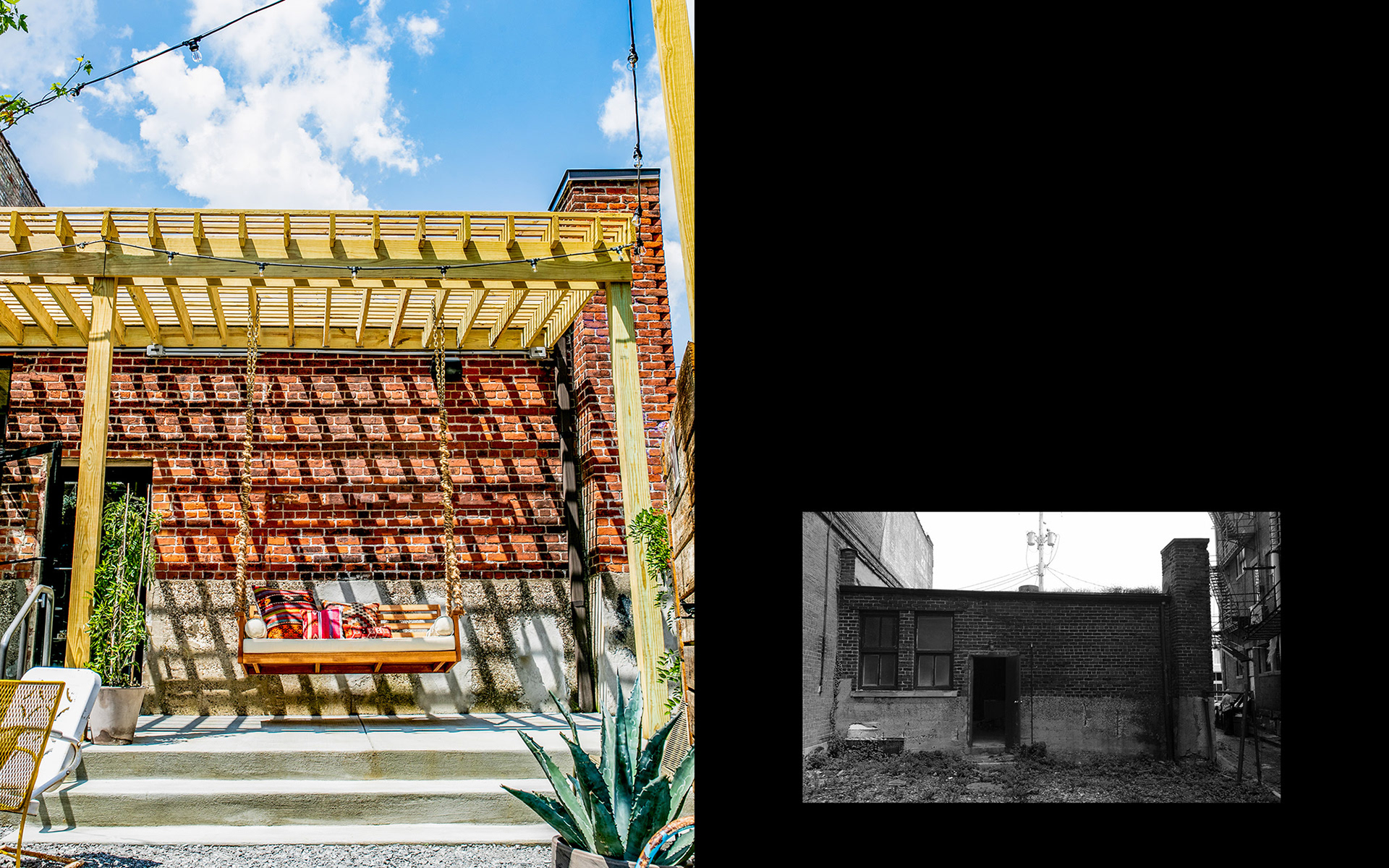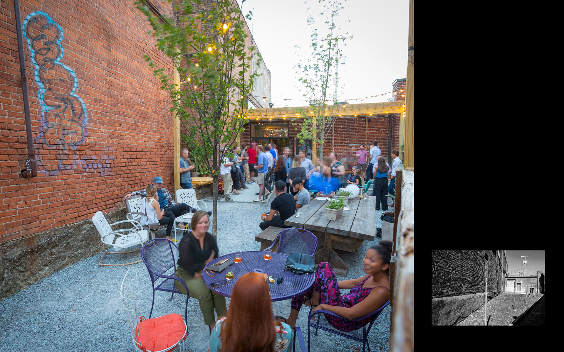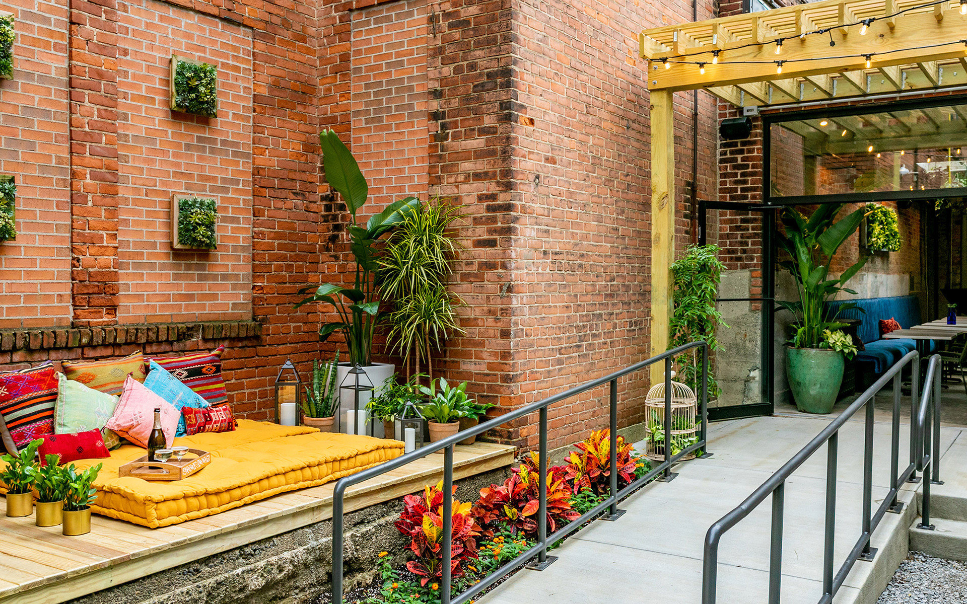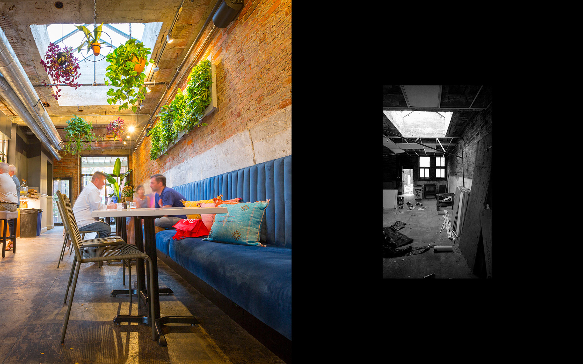 The Grecian blue women’s door unveils a welcoming, light-filled space with large restored skylights and a delicate liquor display. The gritty rough-cast existing floors, ceiling and walls were “frozen,” and offer a stark juxtaposition to the vibrant furnishings and abundant greenery. Aligned with the front door, the back door opens to an urban oasis. Secluded within the urbanity of brick, the patio is flotsam and jetsam, however recovered by the collection of found things inspiring one to browse, configure and make place.