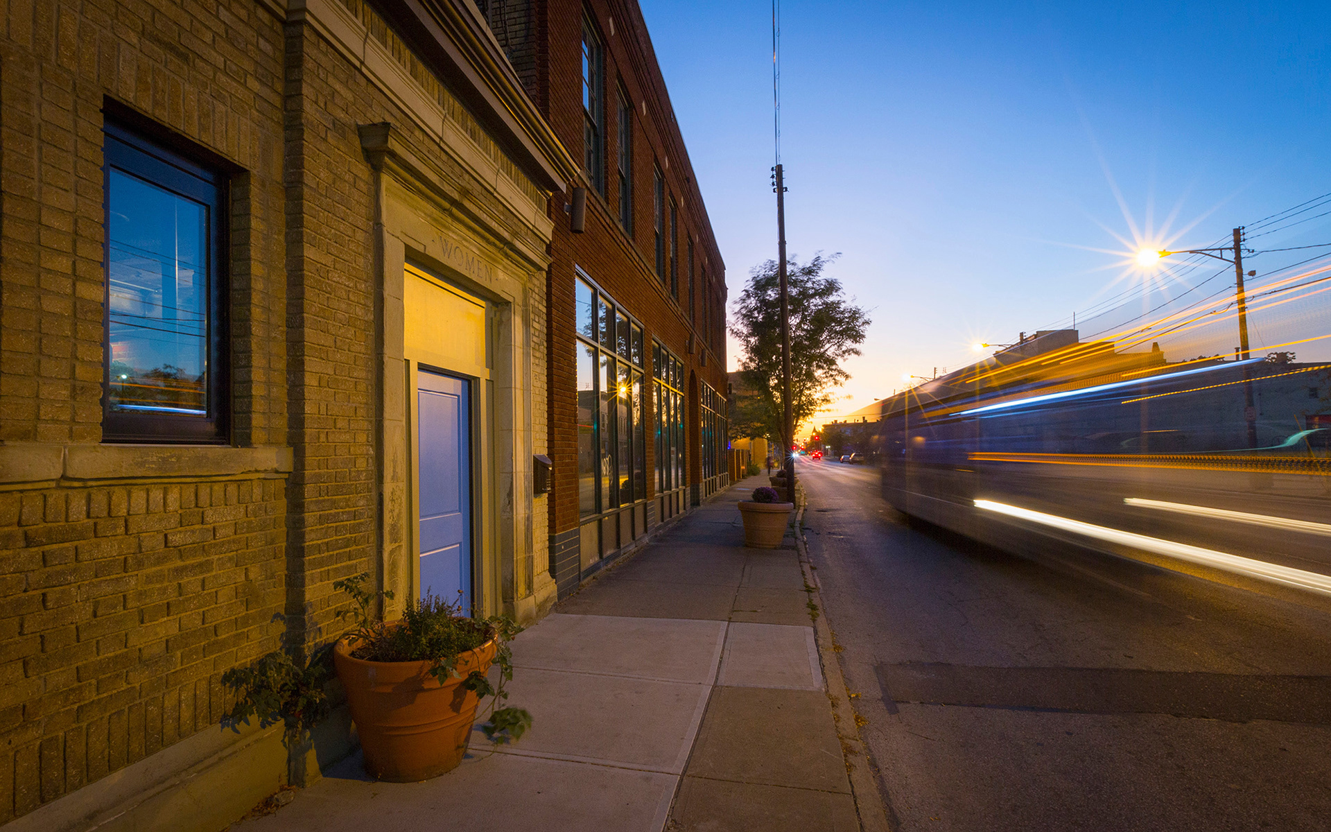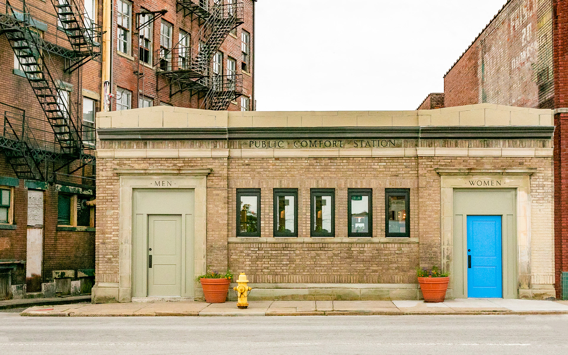 The façade of Comfort Station is stoic and robust, historically discernible by two doors – “MEN” and “WOMEN.” A study in contrasts, the renovation honors the composition but alters the door colors to entice entry.