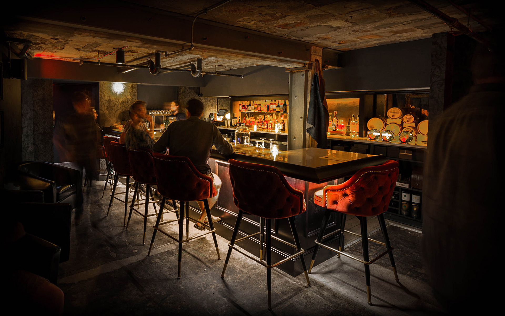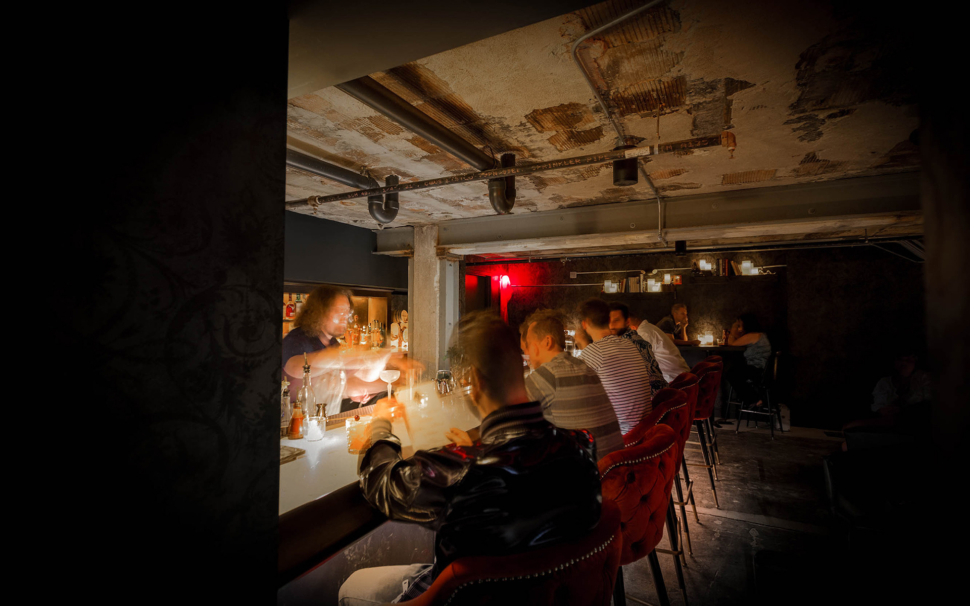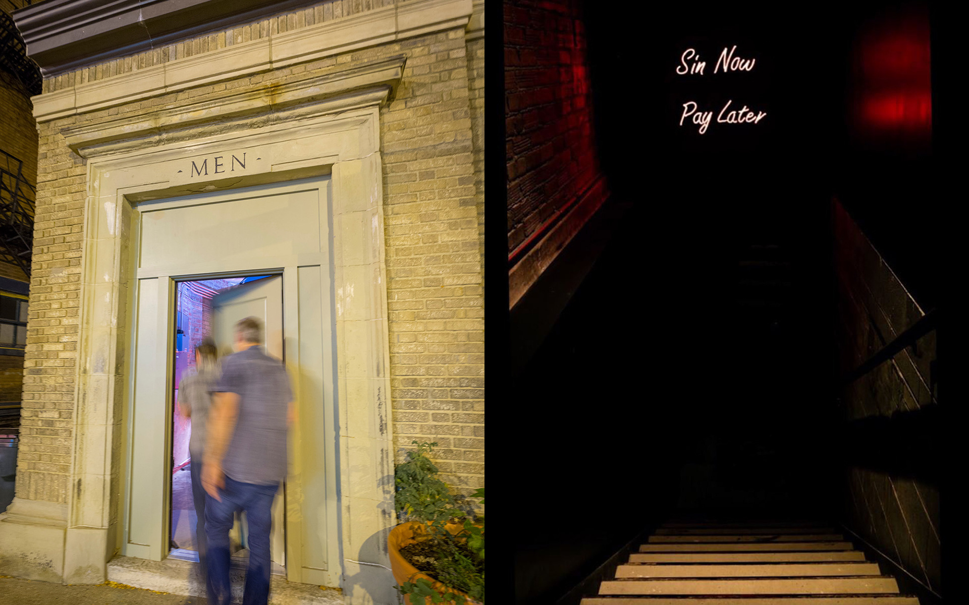 The passive men’s room door inconspicuously opens to a pensive stair leading to the seductively lit basement. A neon sign reads, “Sin Now Pay Later,” voyaging beyond six-feet under to meet Dis Pater. Aligned with Dante’s Inferno, the journey is contrary to that of the blue door: dark, dim, shadowy, taboo and forbidden – rather than Virgil, the bartender is your guide. An assembly of obscure cocktails featuring elusive liquors, lurking corners and chthonic paraphernalia contribute to the antipodal atmosphere below the surface.