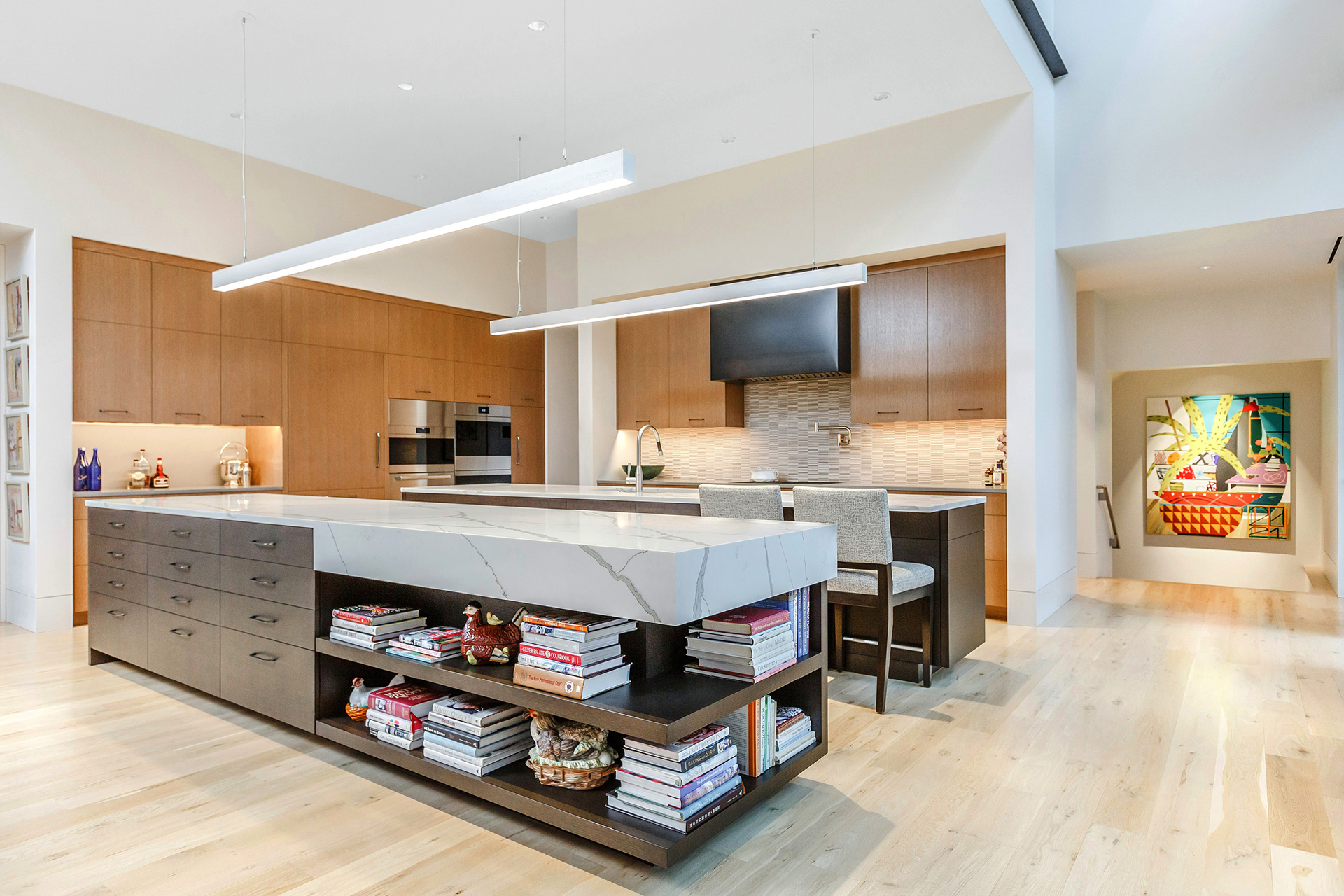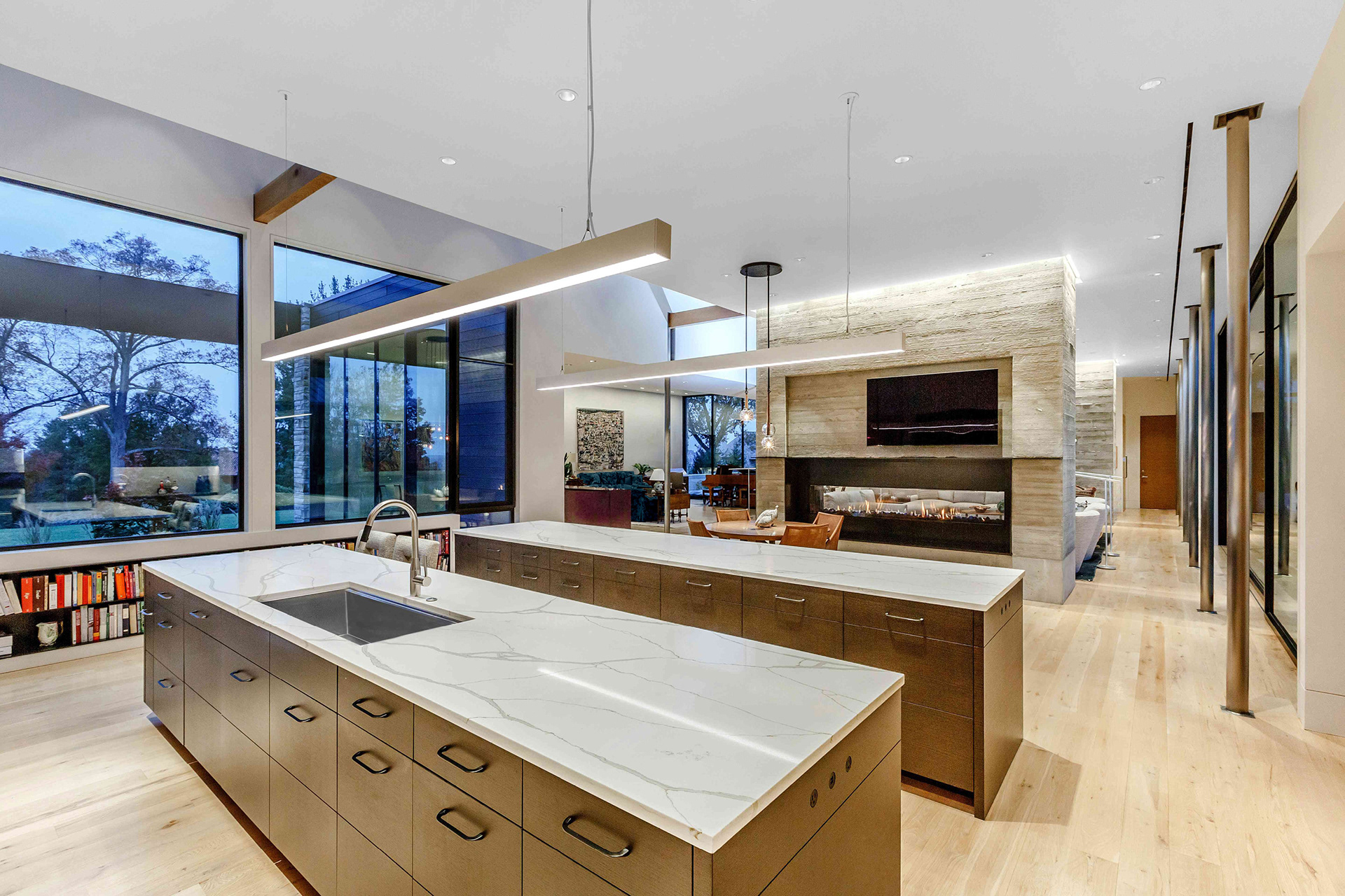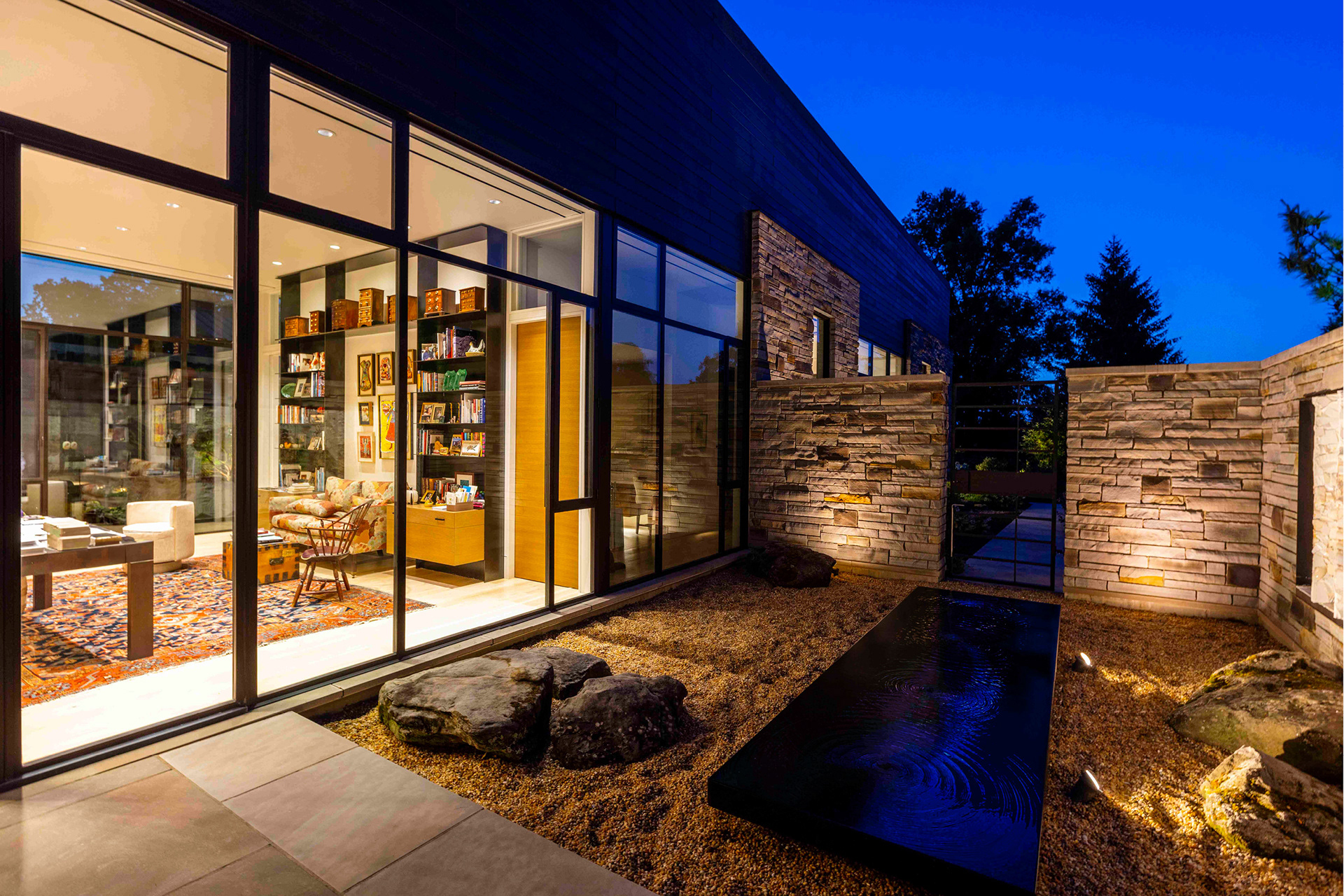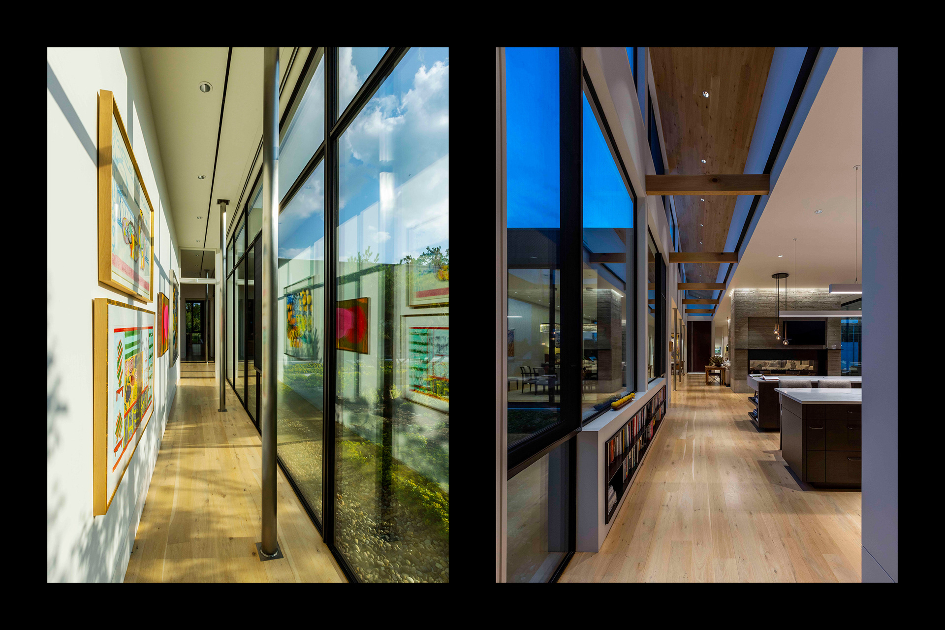 The exterior perimeter of the house offers privacy from the street and from the adjacent neighbors, which includes an institutional playfield and parking lot. While the building’s perimeter offers carefully curated views and light, the interior of the home opens into a sixty-feet-square central garden courtyard. Every space in the home has direct access to this garden and light with each private and service space shielded in a protective volume. These carefully arranged volumes provide the otherwise open plan with wall space for the display of a substantive art and book collection that can be viewed from all areas inside and outside of the home. While the courtyard garden takes cues from Japanese Zen gardens, its form is generated from cloistered architecture in which the traditional arcade has been ‘captured’ and enclosed for circulation, the linking of spaces, and the creation of a continuous gallery. An entry spline reaches high above the great room to bring the coveted southern light deep into the plan.