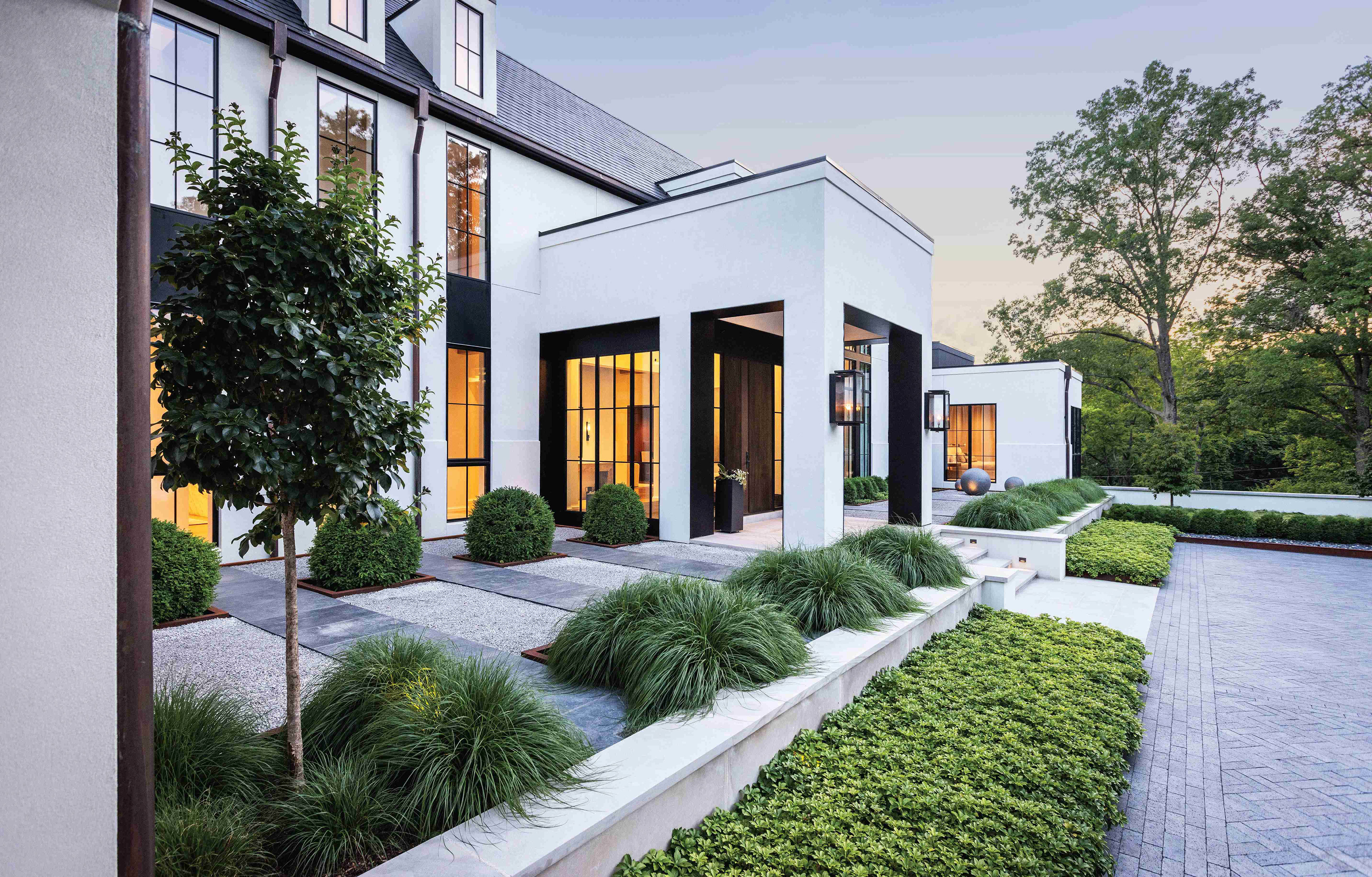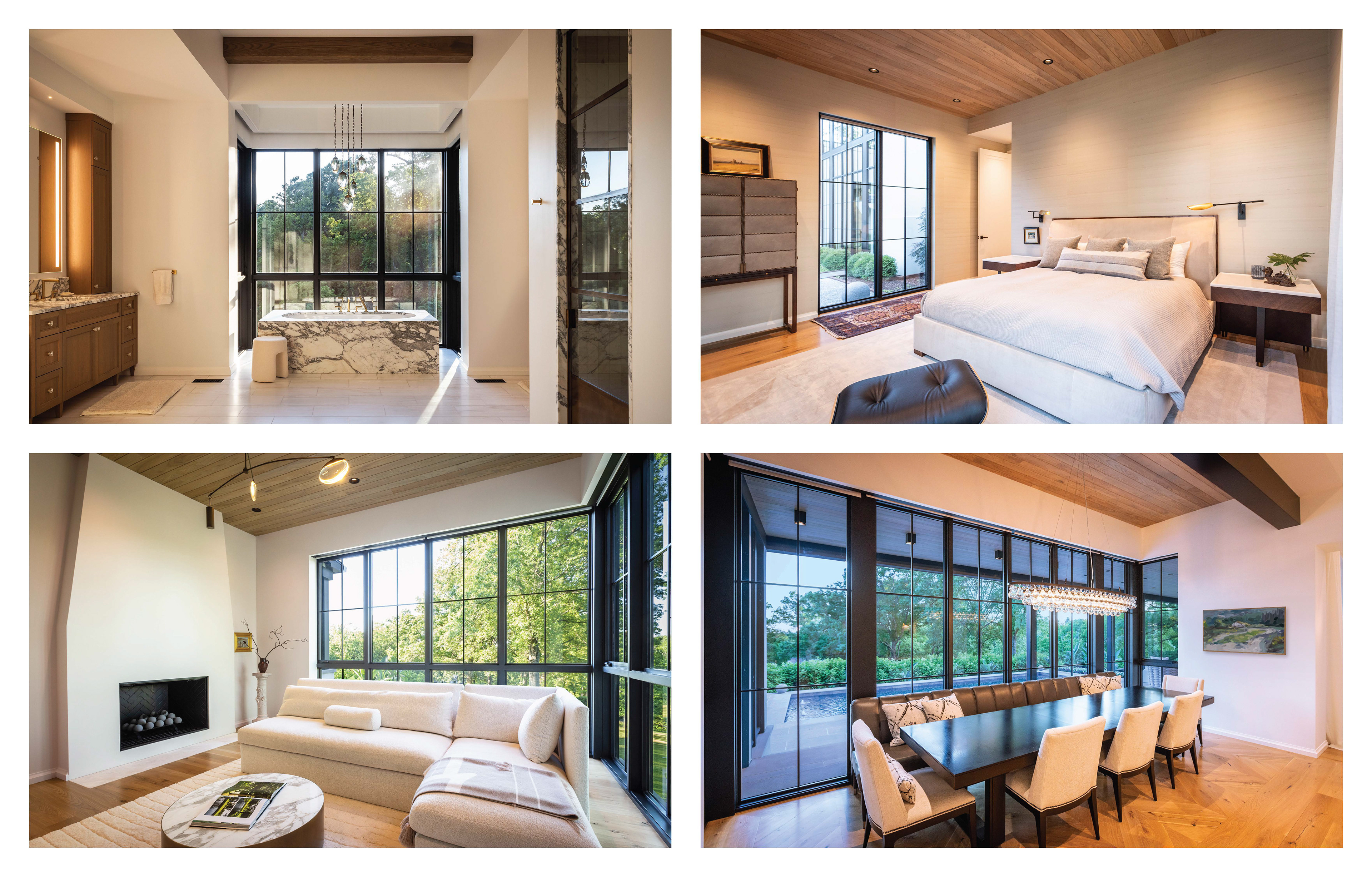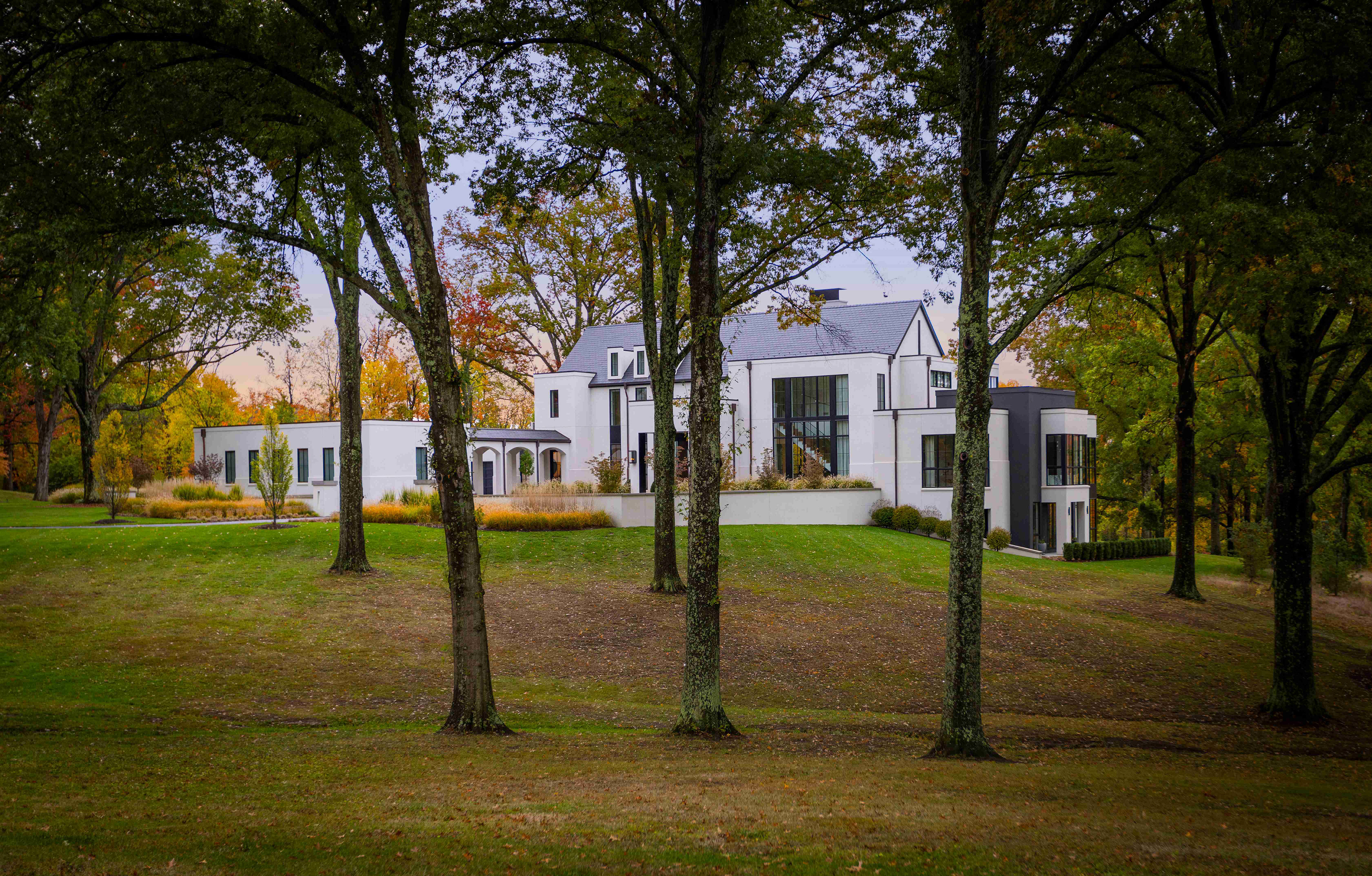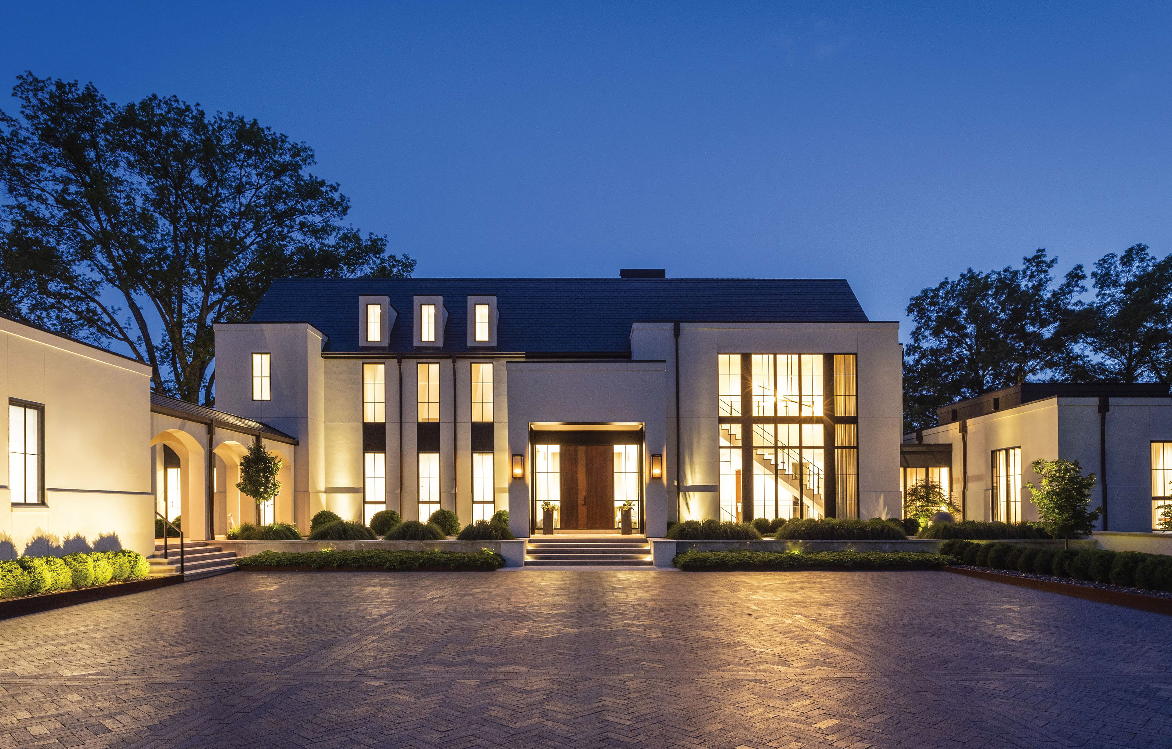 Like many historical manor houses, the home features mullioned windows, a water table, gas lanterns, a formal axial approach, and a steeply pitched slate roof. Here, though, these elements are arranged in an asymmetrical yet balanced composition. Along with a modest material palette, these components are paired with decidedly modern elements, including floor-to-ceiling windows, metal portal frames, and metal chimney cap detailing. The light-colored cement-stucco exterior highlights dappled sunlight as it streams through the preserved trees, while corner windows emphasize long, diagonal views through the spaces and into the landscape. The interplay between the modern and traditional brings a fresh interpretation and appreciation of each.