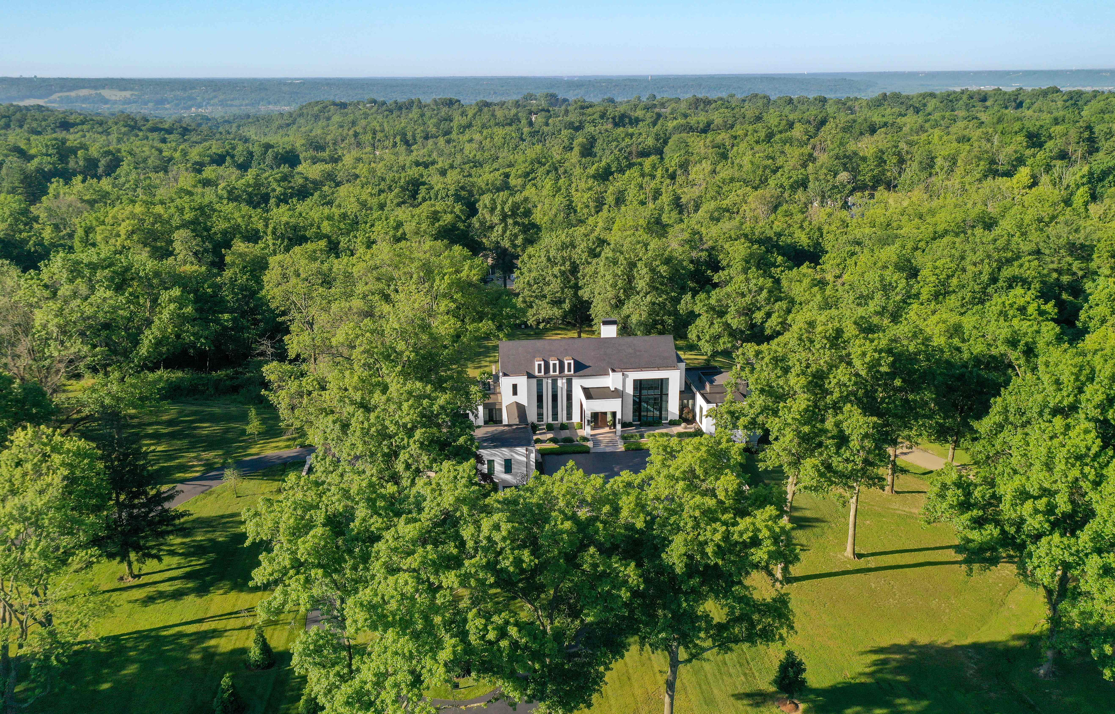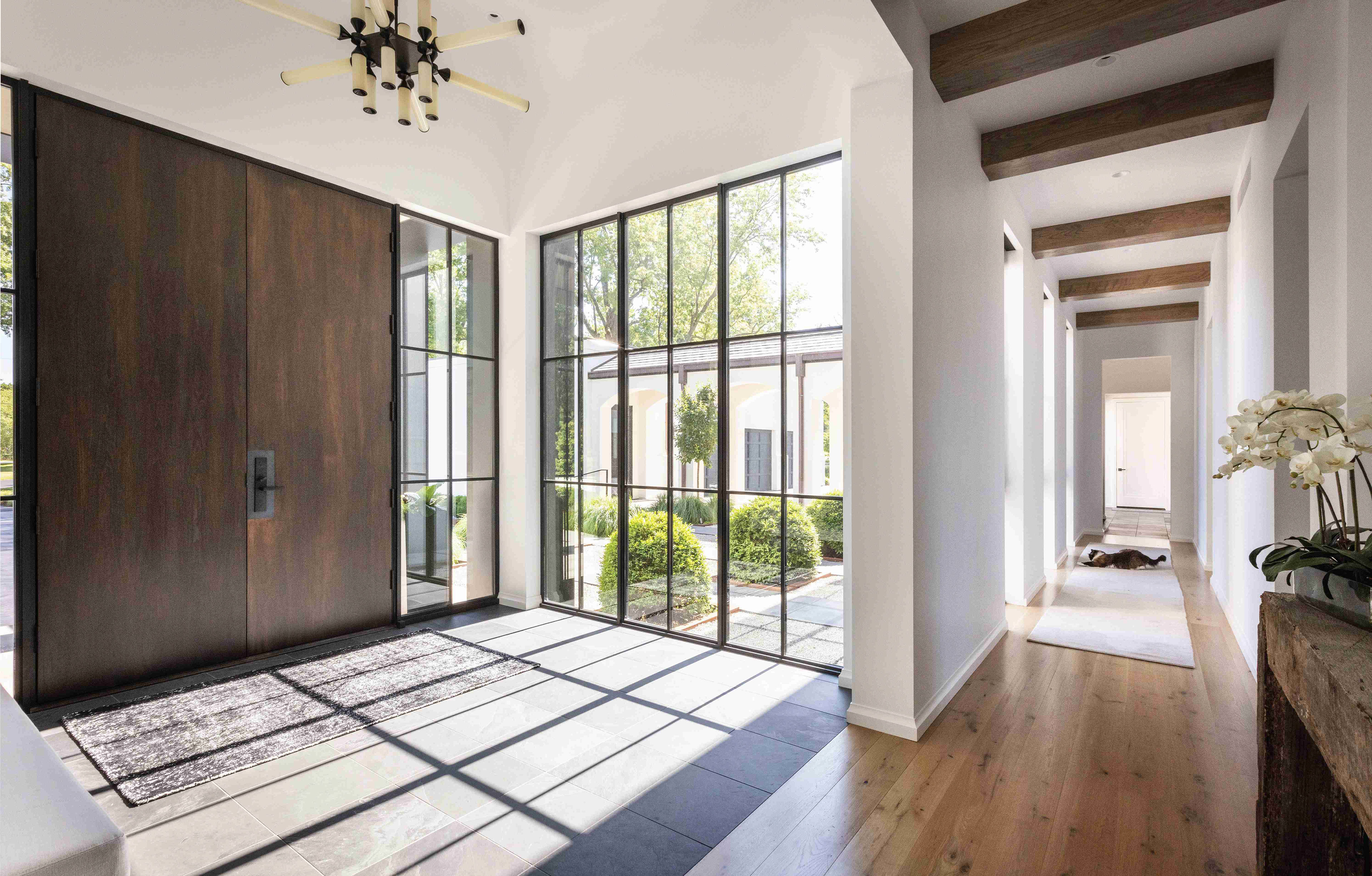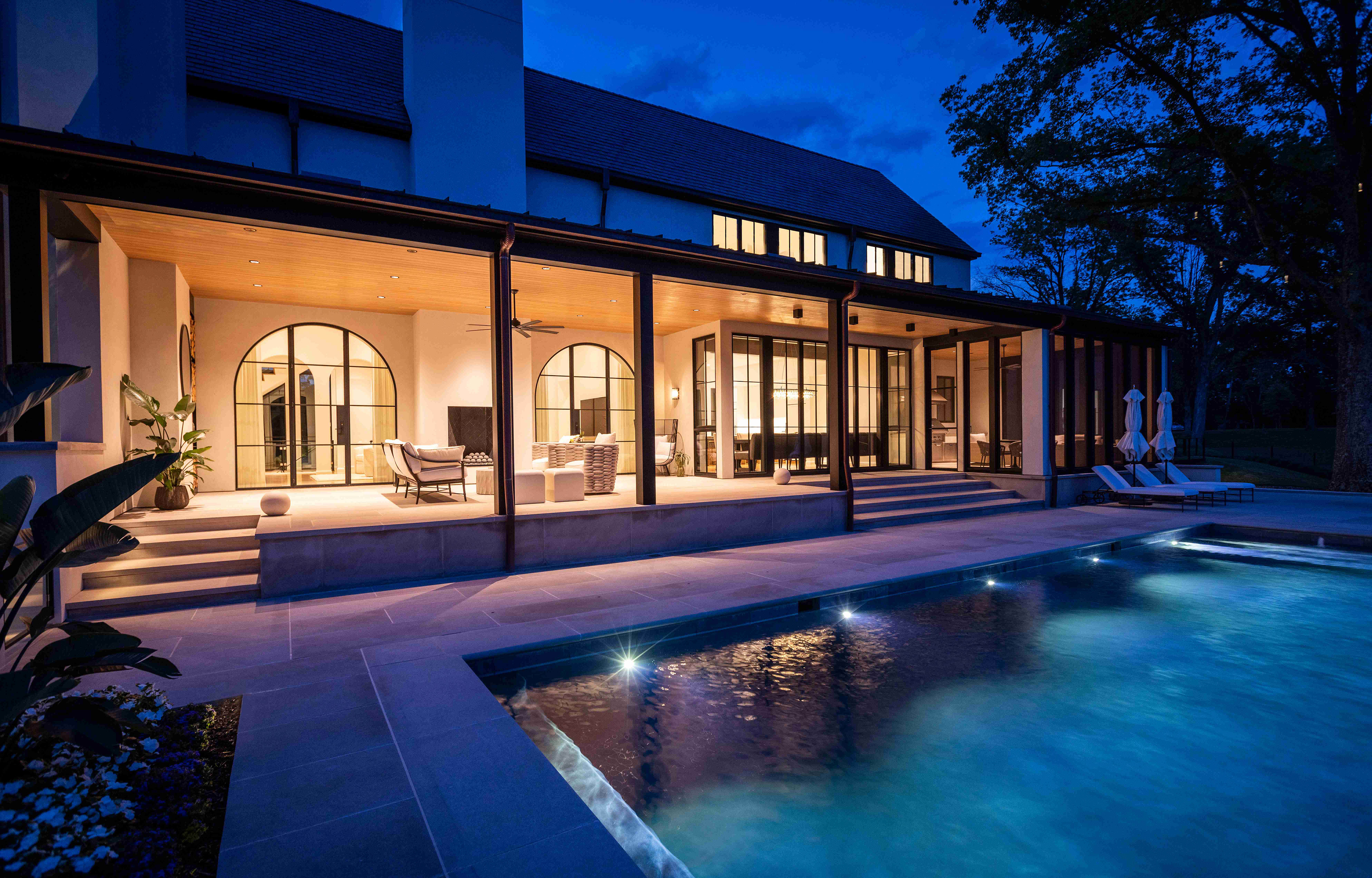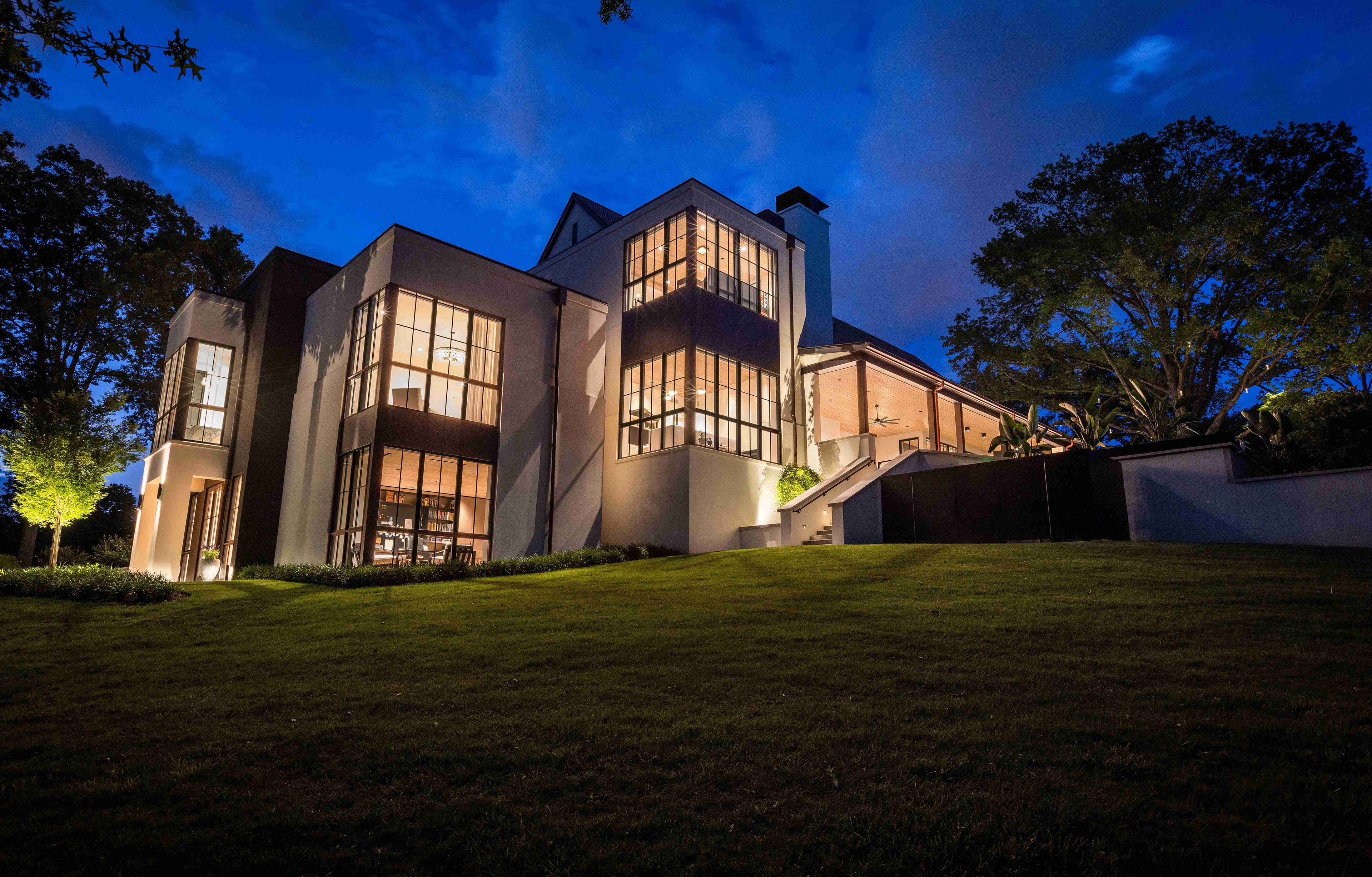 Like many historical manor houses, the home features mullioned windows, a water table, gas lanterns, a formal axial approach, and a steeply pitched slate roof. Here, though, these elements are arranged in an asymmetrical yet balanced composition. Along with a modest material palette, these components are paired with decidedly modern elements, including floor-to-ceiling windows, metal portal frames, and metal chimney cap detailing. The light-colored cement-stucco exterior highlights dappled sunlight as it streams through the preserved trees, while corner windows emphasize long, diagonal views through the spaces and into the landscape. The interplay between the modern and traditional brings a fresh interpretation and appreciation of each.