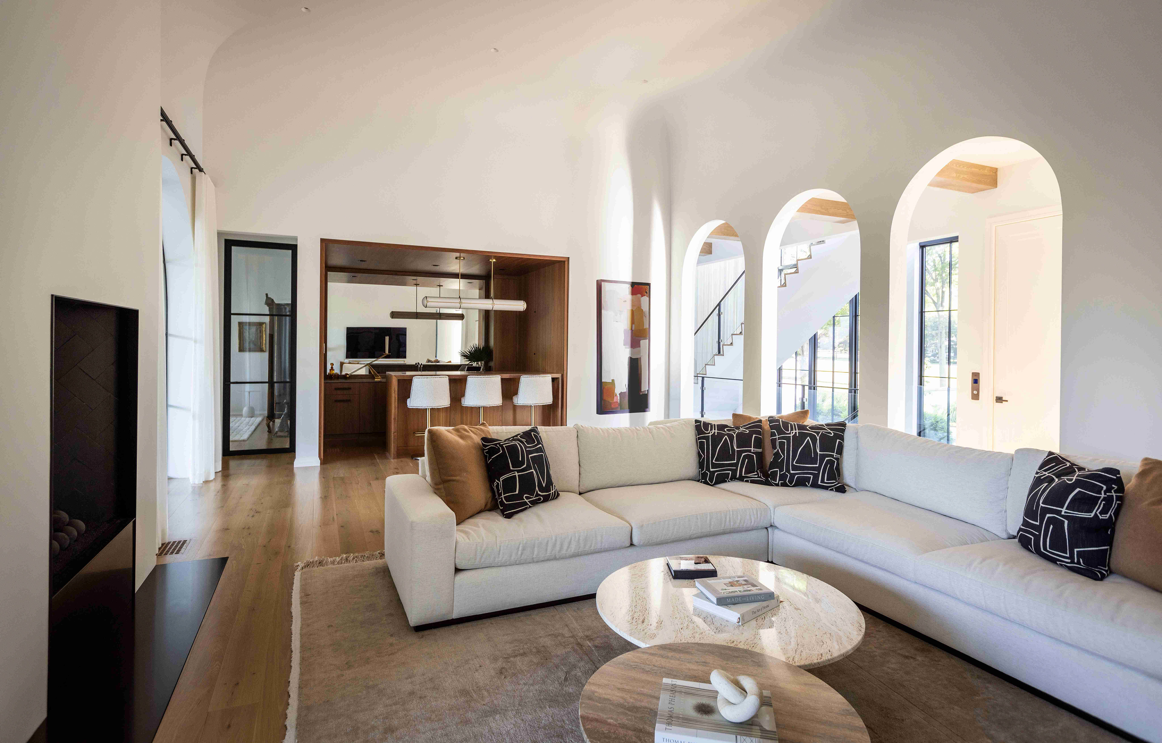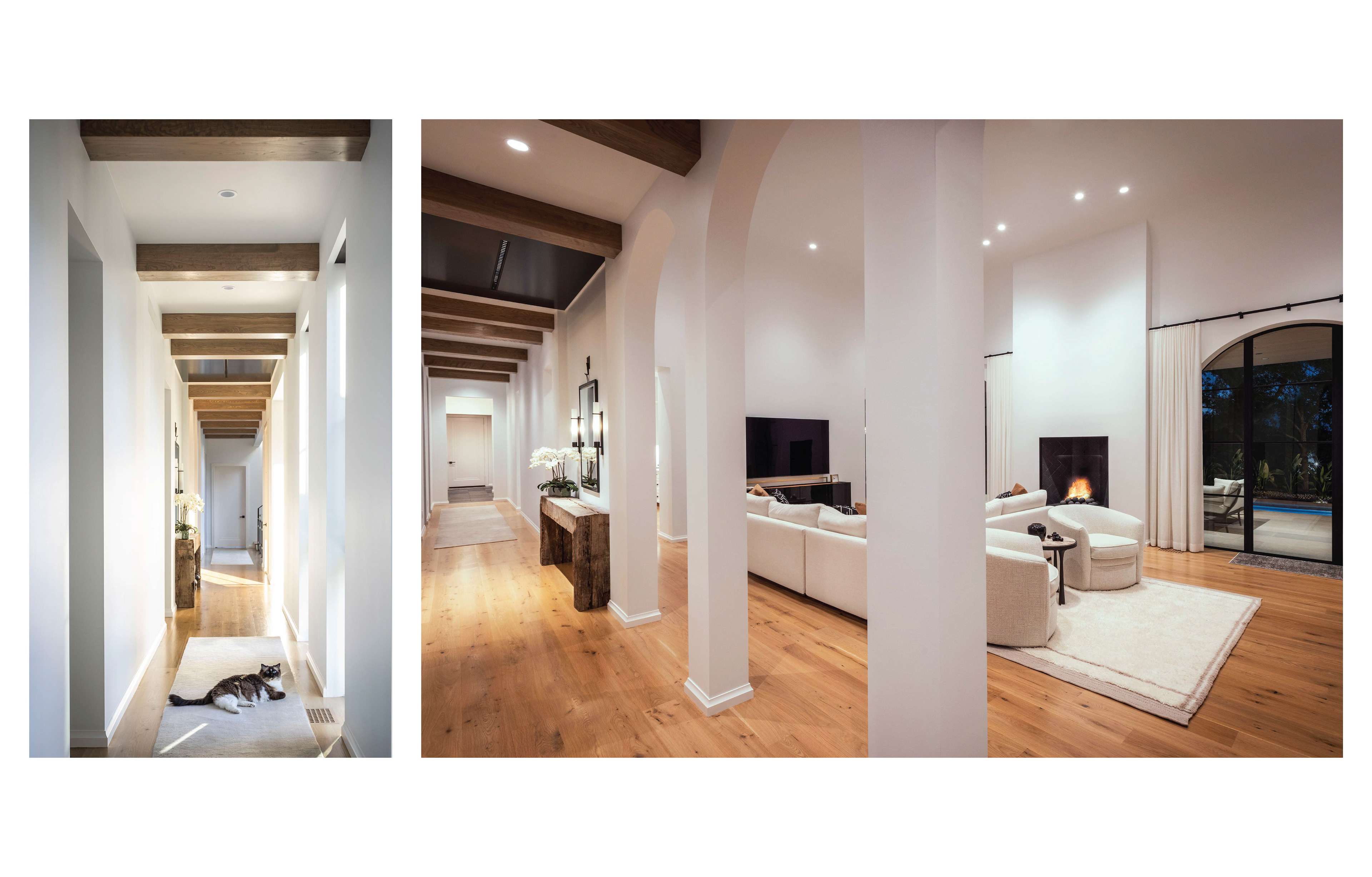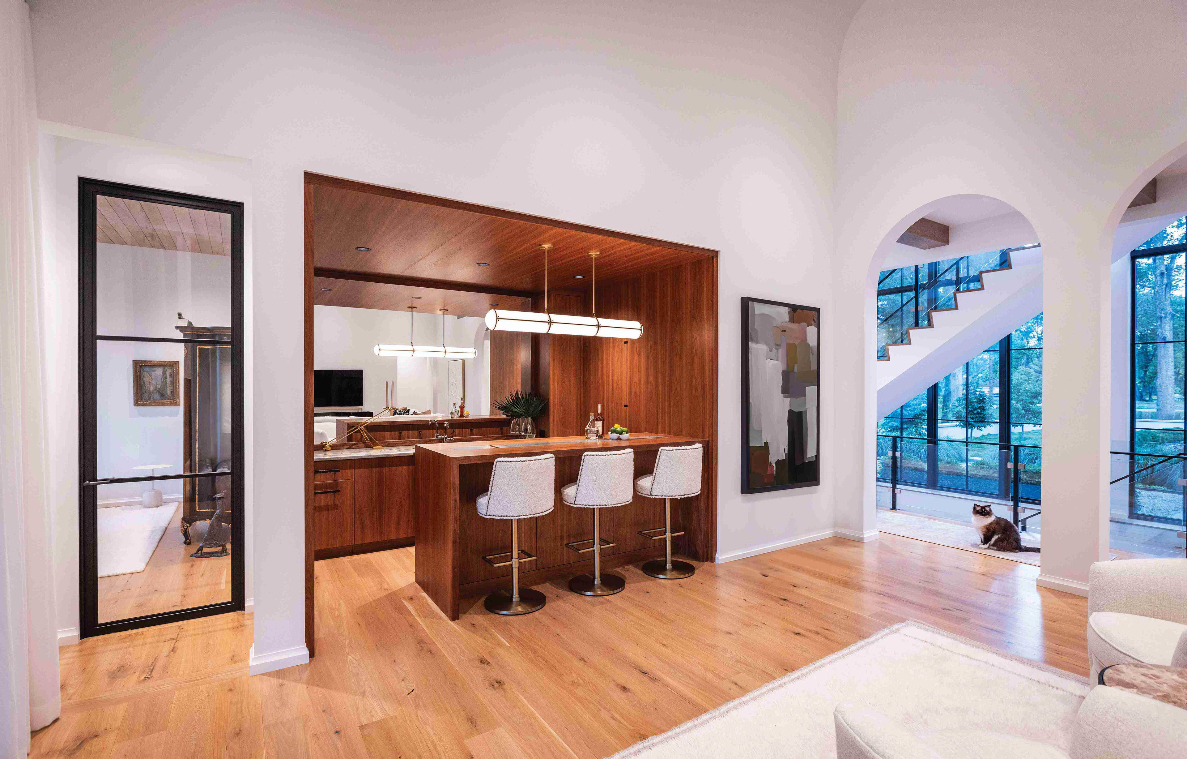 Located on a rolling parcel outside the city, the home is situated precisely between mature oak trees. This siting results in framed views of the house through the trees and curated views of the landscape from the house. The north side of the home stoically addresses the street and is enhanced in privacy and seclusion by a shielding garage, connected to the house by a covered arcade. This creates both a formal and informal entry court, each with its own layered entry sequence, leading through the house and toward the rear yard for indoor/outdoor entertaining.