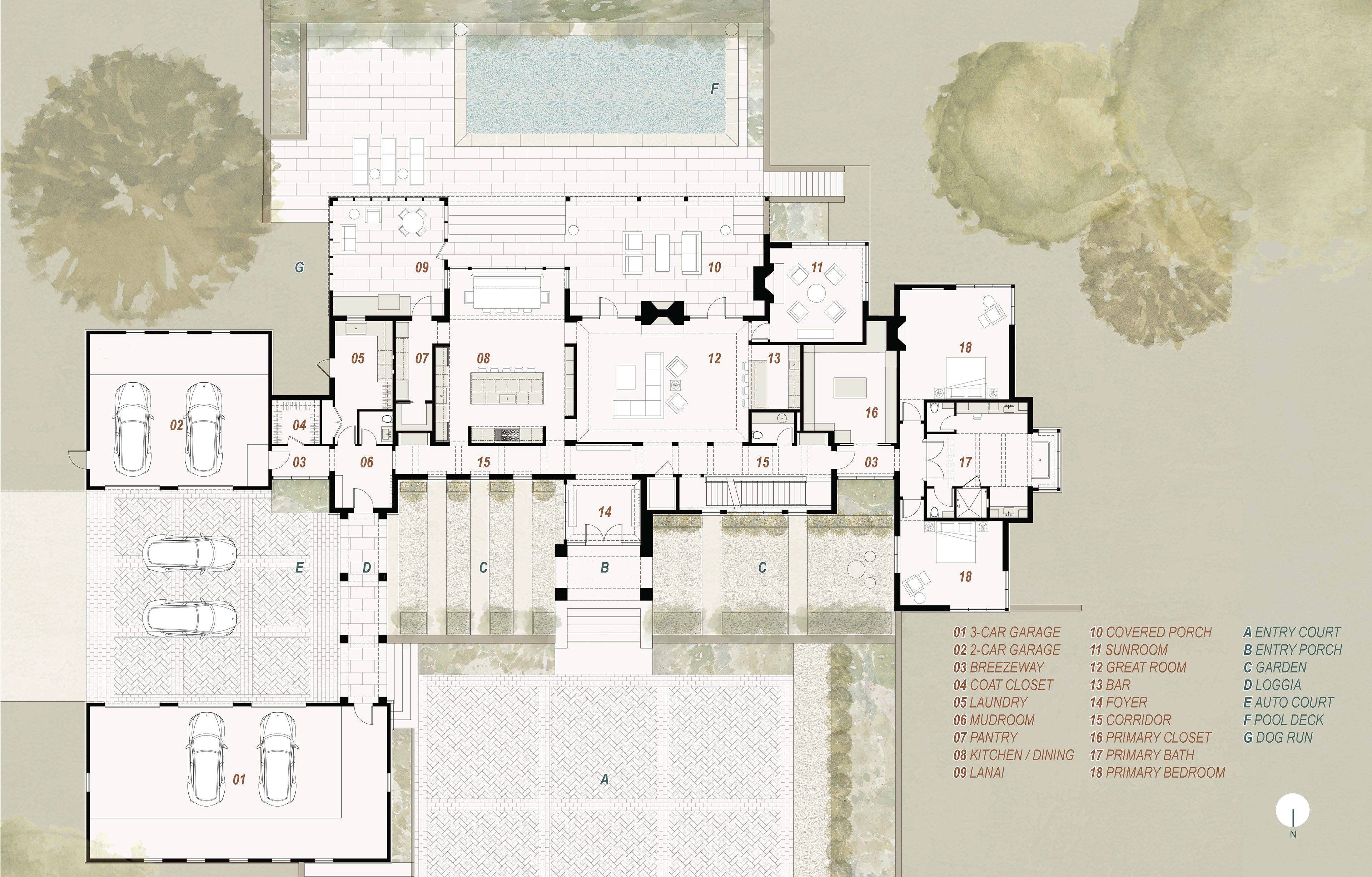Arranged in pavilions, the home features a semi-open plan linked together by a long corridor that doubles as a mediating privacy screen. The covered porch along the back of the house provides for more informal circulation and allows access to the terrace and yard. Steps from the covered porch land on an elevated pool deck, overlooking the rear yard.