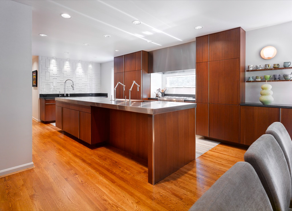 This suburban house was composed of a series of small rooms arranged in a manner befitting a different era. By combining the small, introverted kitchen with the adjacent dining room (previously separated by a glass block wall), the renovation produced a communal space suitable for preparing, eating and conversing, with the kitchen serving as a stage. The long, linear strips of cabinetry were generated by a need for culinary efficiency, while the island permitted both owners to work in distinct zones.