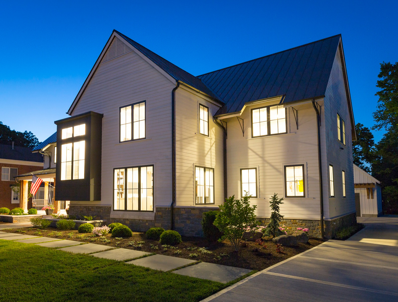 The Remington Residence is located on a tight infill lot in an established suburb. The owners, transplants from the South, wanted a 21st century regional farmhouse – including the commensurate wood porch and swing that makes a house a home. Owing to an unconventional site that includes the adjacent properties’ side, front and rear yards, a strategy was developed to extend the house along the property lines in order to create a cloistered effect. The result is a thin ‘C’ shaped plan that features the development of a variety of private exterior spaces: a screened porch, an auto court, an elevated dining terrace, a garden, and a covered porch that eventually spills out to the rear yard. By creating protracted views through multiple layers of spaces and taking advantage of the site’s topography, the otherwise small site feels enlarged. Large north-facing banks of windows and doors open to the private exterior spaces expanding the home’s interior, while walls at the perimeter fortify the site.