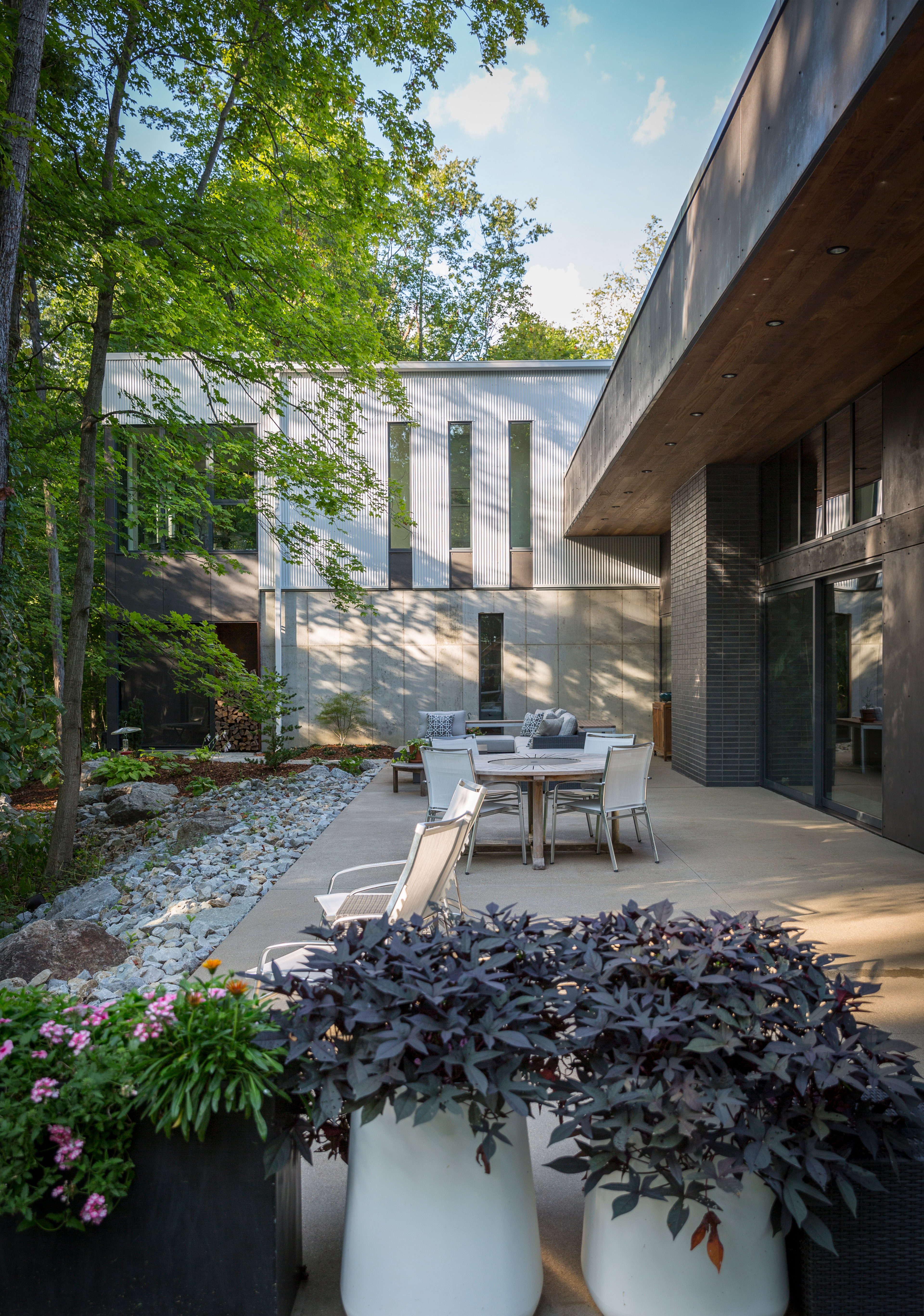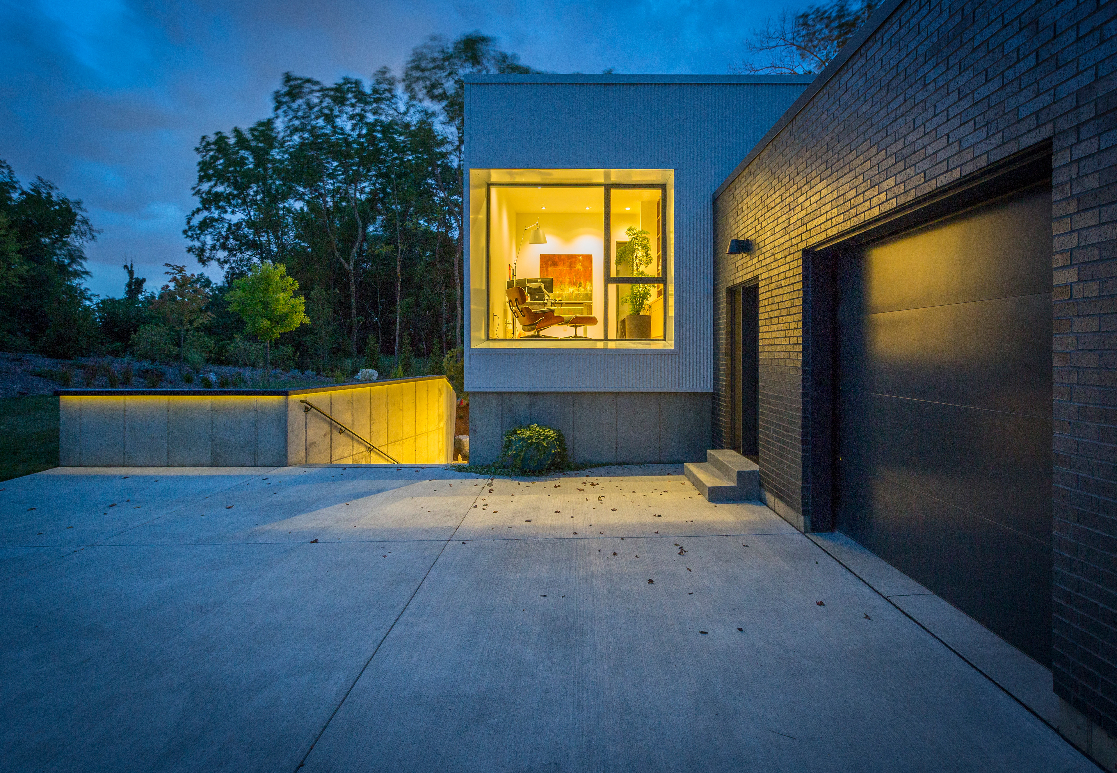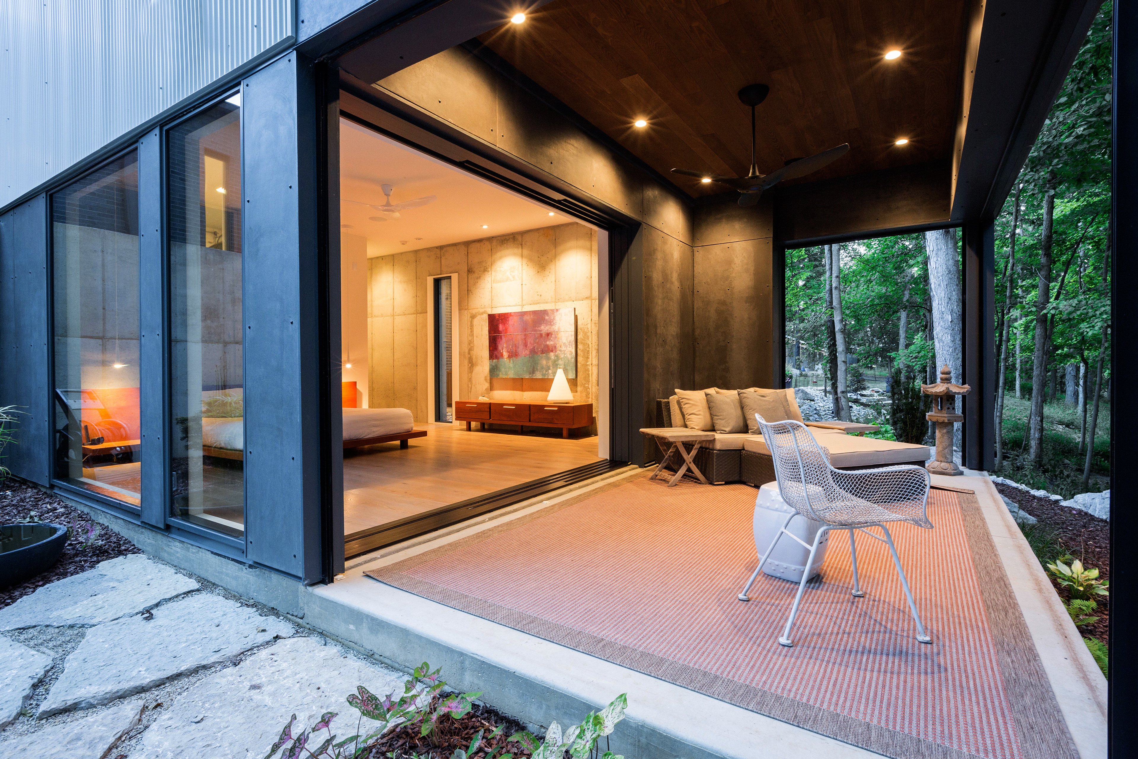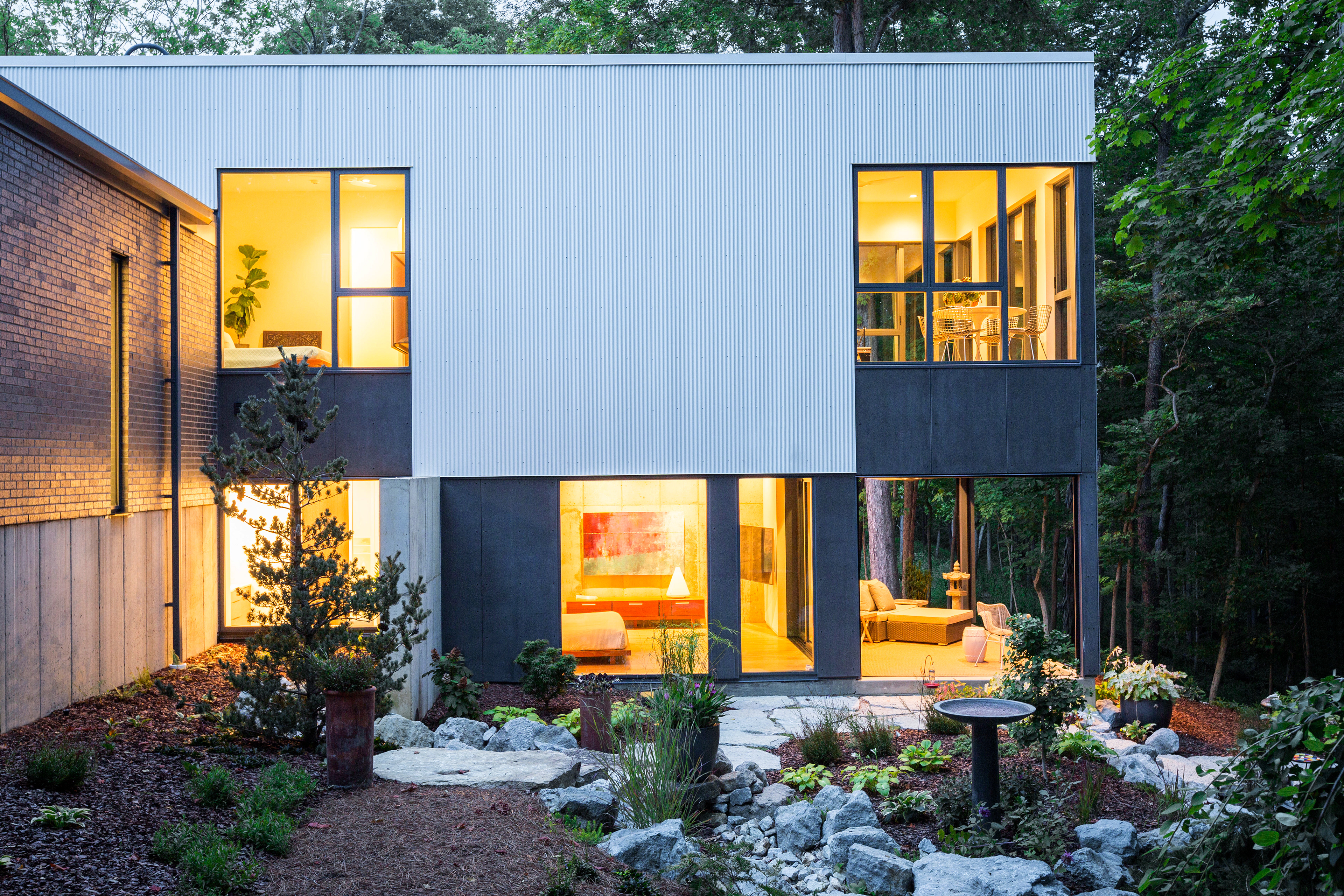 After many years of travel, work abroad, and life in a suburban home, a couple desired a simple modern home that would live more like a retreat. They sought a new grounding attuned to the earth and a place of solitude suitable for their animals and farm-to-table lifestyle. In this pursuit, they purchased a hillside lot overlooking a wooded ravine.