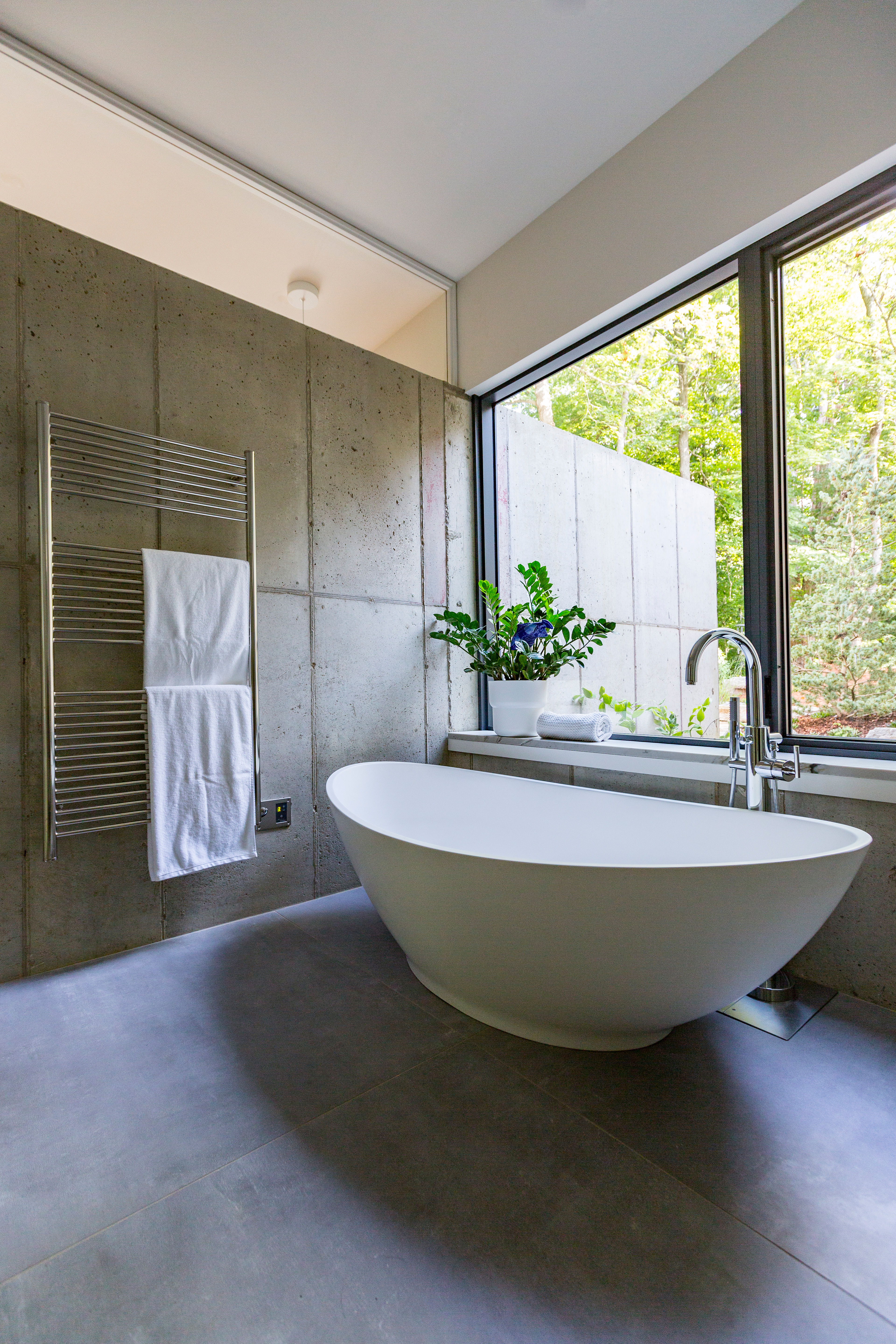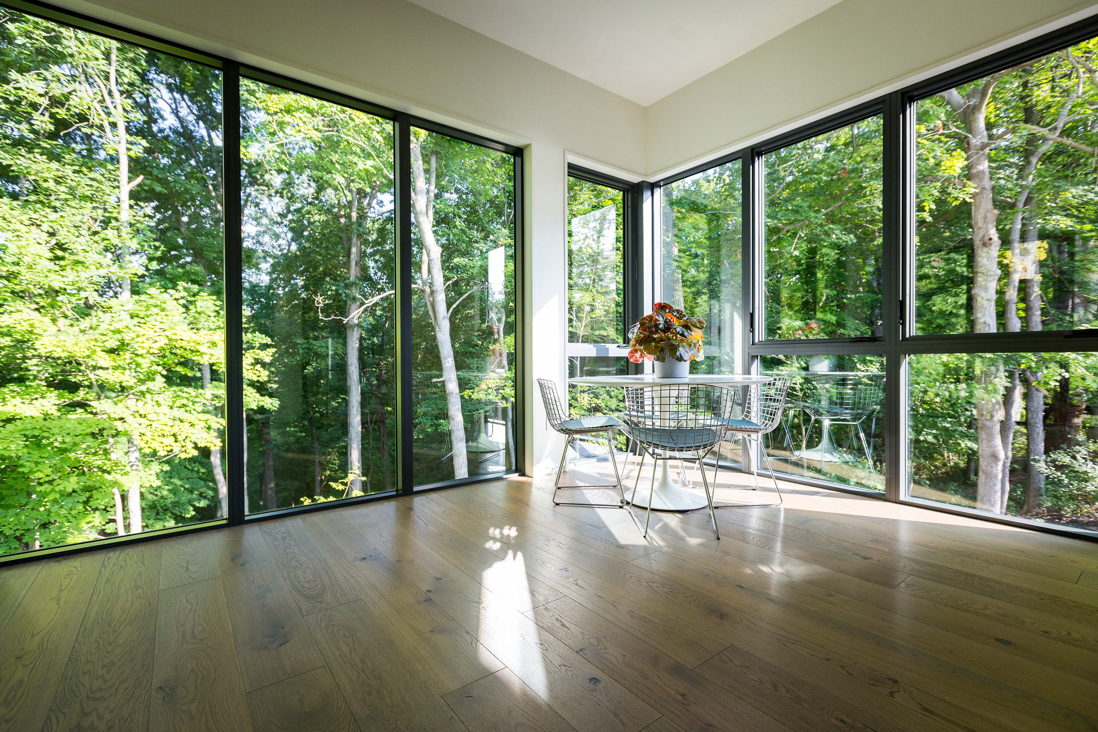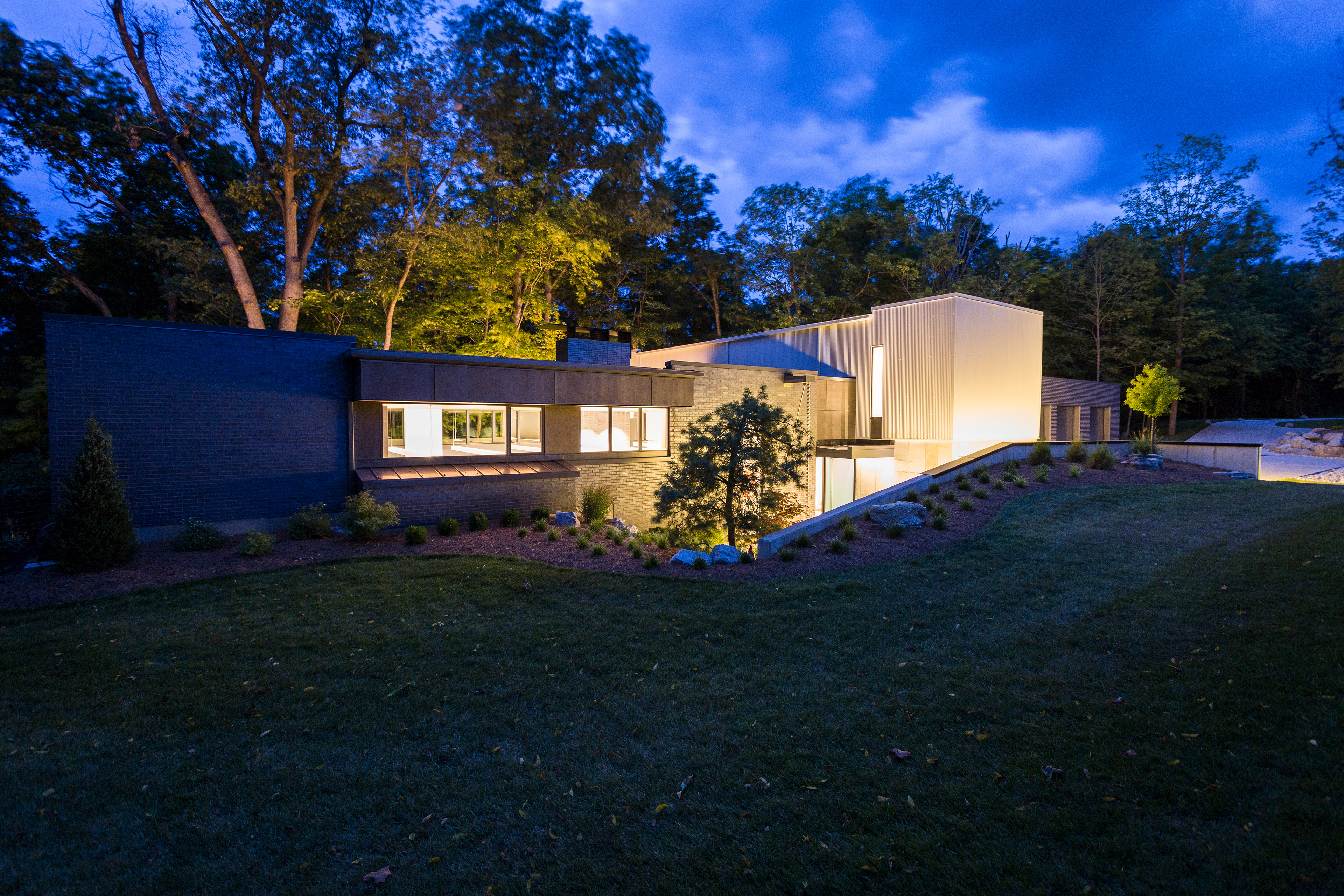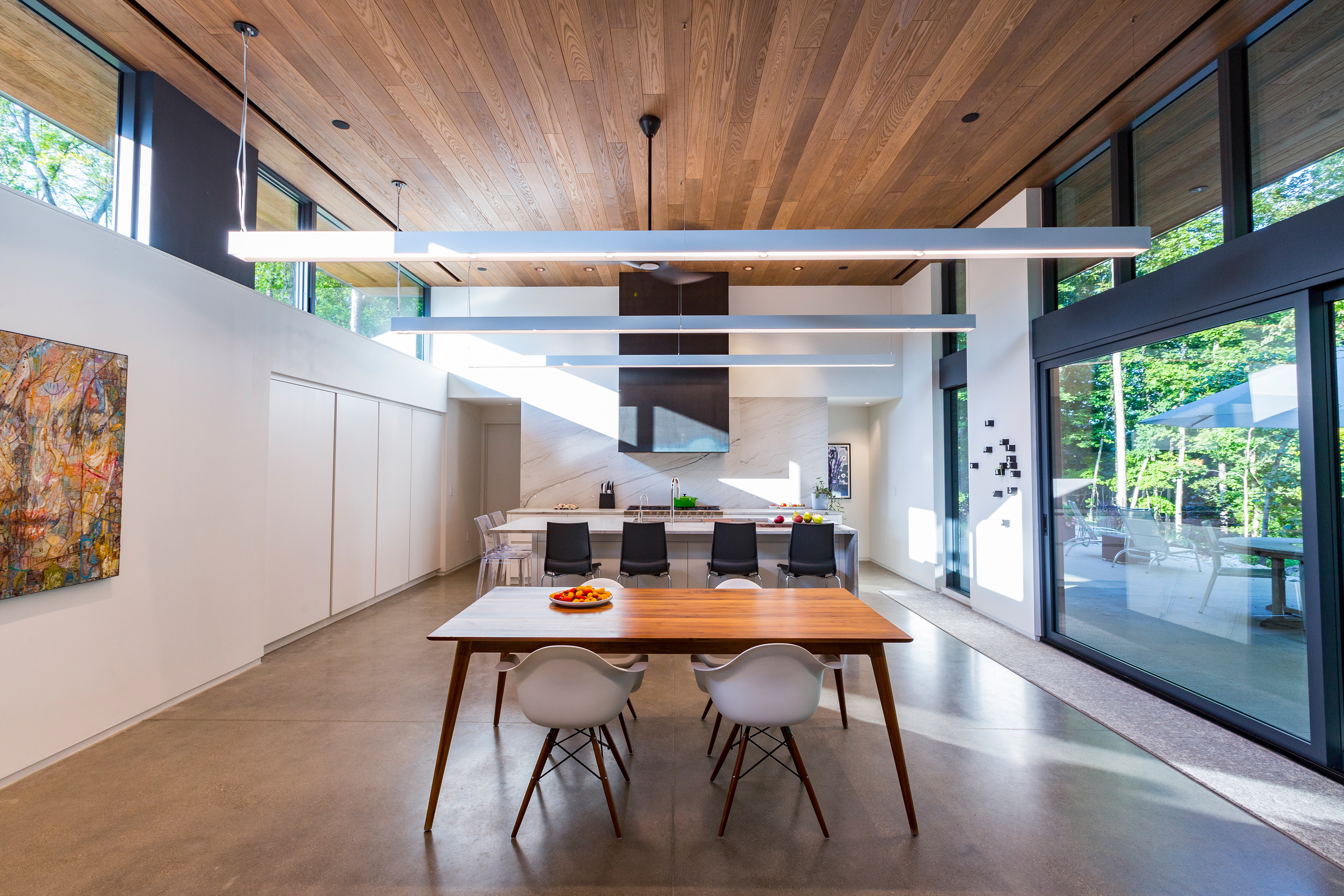 After many years of travel, work abroad, and life in a suburban home, a couple desired a simple modern home that would live more like a retreat. They sought a new grounding attuned to the earth and a place of solitude suitable for their animals and farm-to-table lifestyle. In this pursuit, they purchased a hillside lot overlooking a wooded ravine.