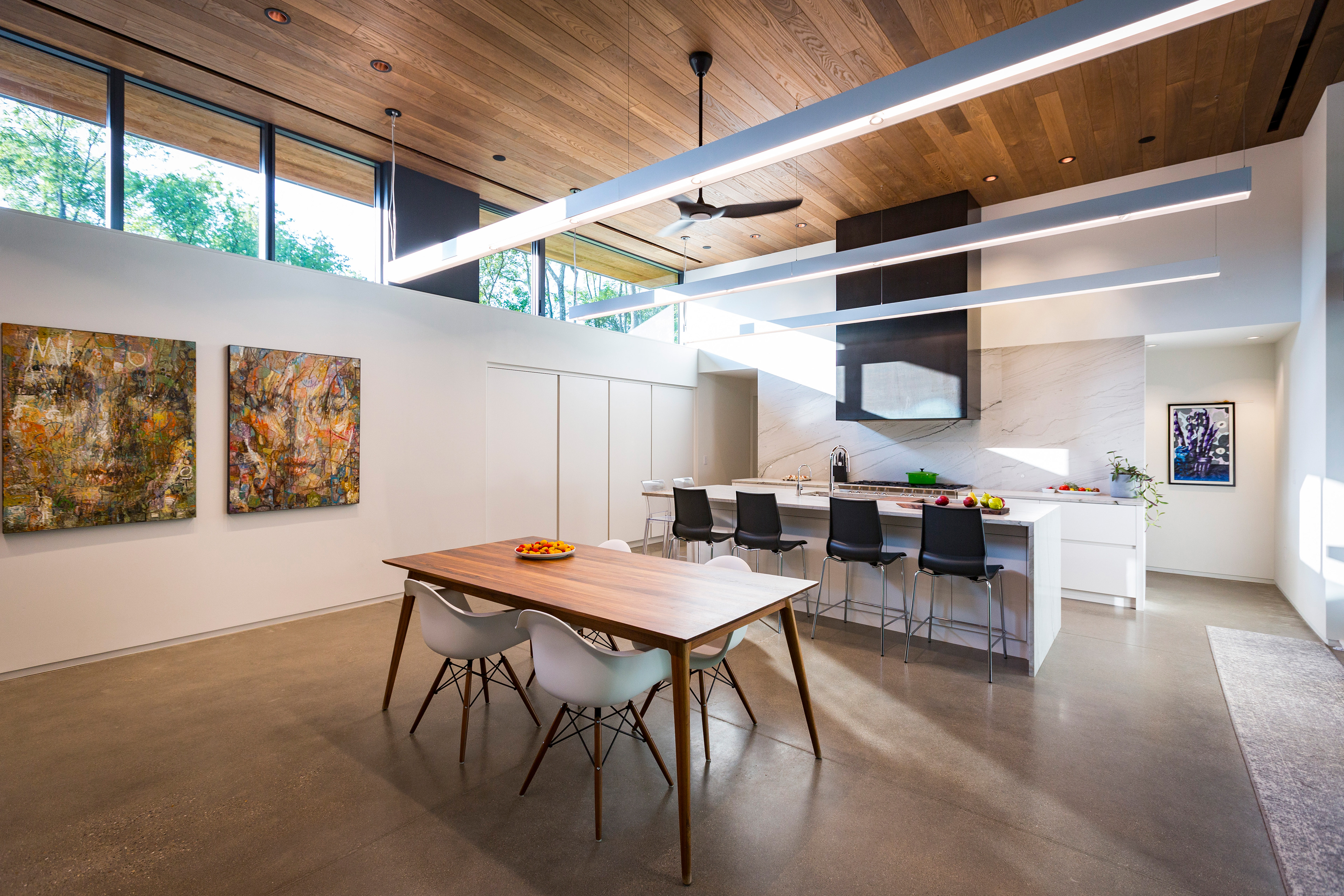 To allow entry, a site wall parts the earth from the house, inviting landscape and stair to spill between. This acknowledgment of the house as sympathetic to and continuous with the earth is underscored by the use of exposed concrete at the floor surface. The living volume features clerestory windows and a warm wood canopy, releasing westward to a terrace on grade and the ravine beyond.