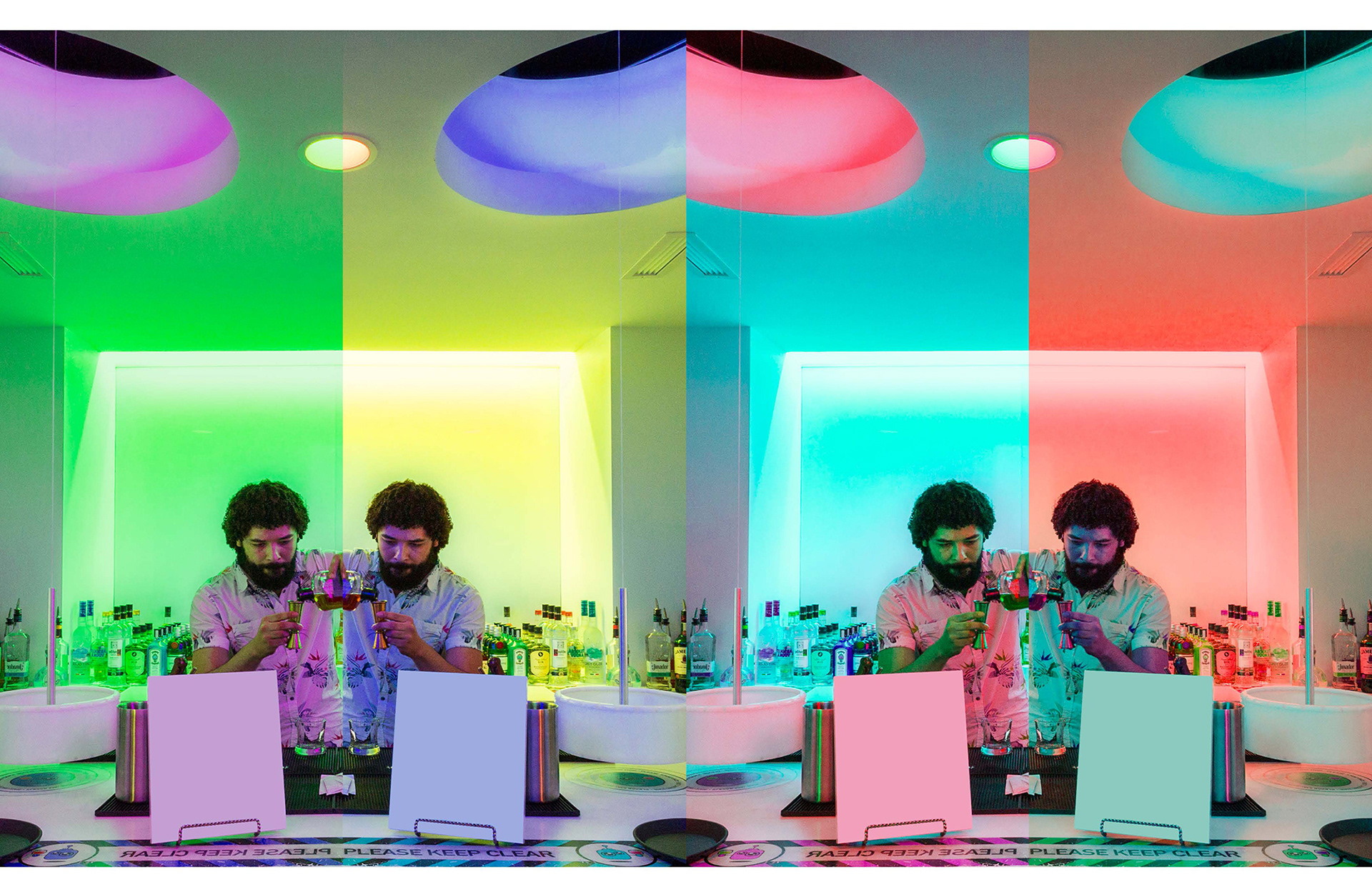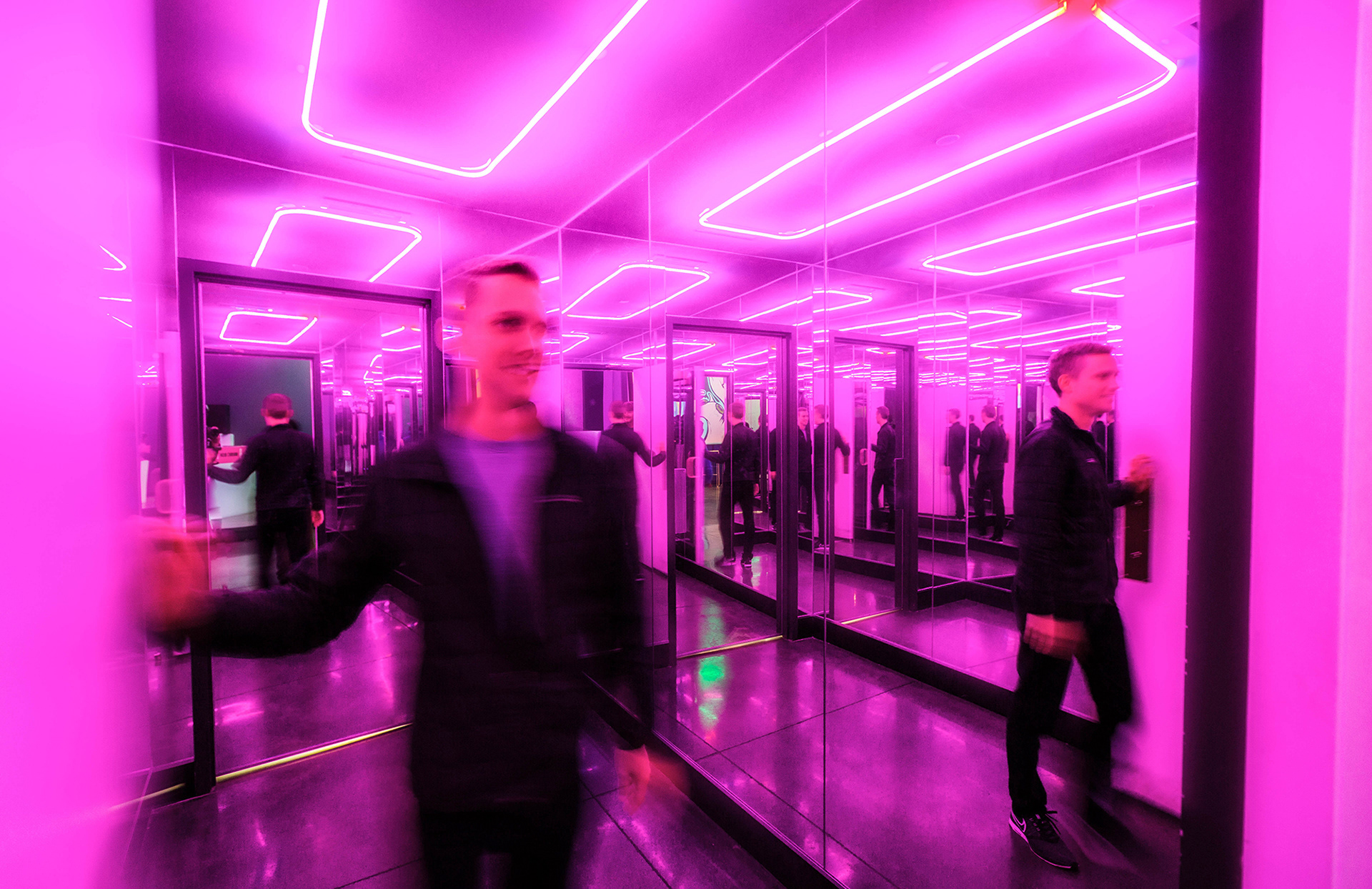 The experience begins as guests arrive at a sleek, minimalist concourse after clearing airport security, and grabbing a pre-flight Kumamon cocktail. When it’s time to board, passengers enter “the teleporter”, an entirely mirror infinity room, which instantly transplants them from the streets of Cincinnati to a neo-futurist vision of Tokyo. Robots and neon flash over head, as any wannabe rock-star belts out a lively, version of their favorite song.