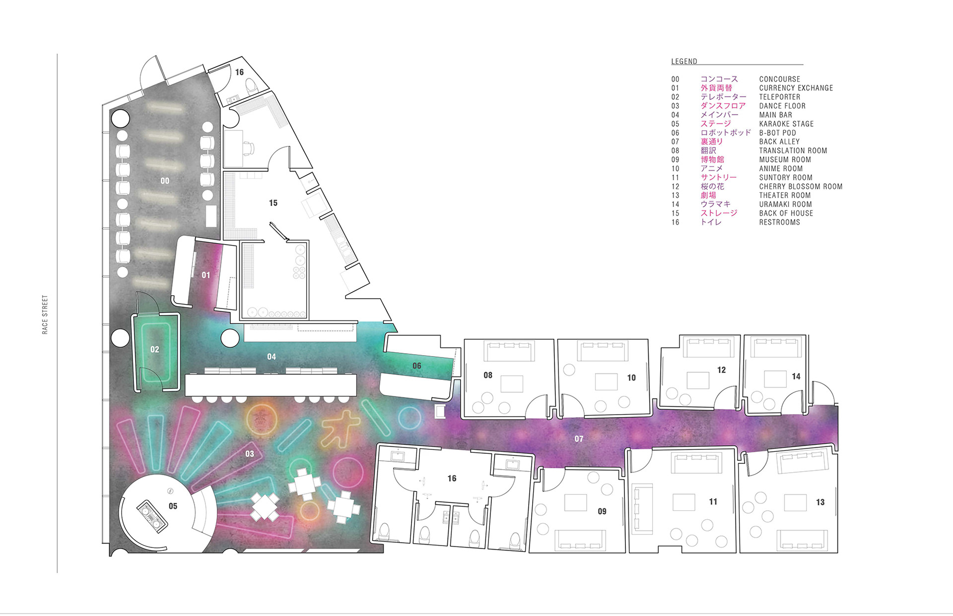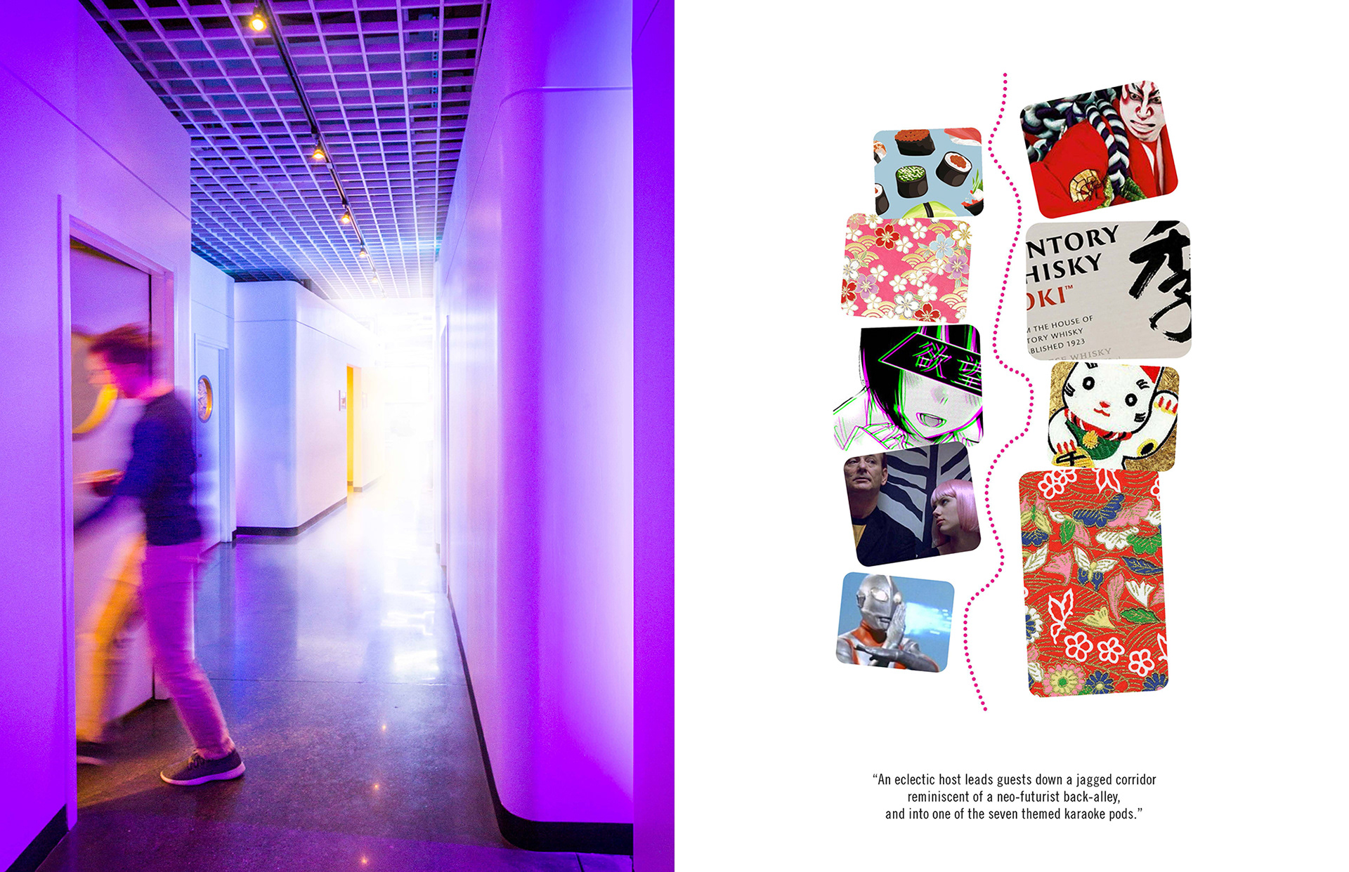 For those guests wanting a further cultivated experience, rental able karaoke pods are available to accommodate different sized groups. An eclectic host leads guests down a jagged corridor reminiscent of a back-alley, and into one of the seven uniquely themed karaoke pods. These pods where designed to become karaoke machines, built to provide a tailored user experience capped off with full bar service delivered by robot.